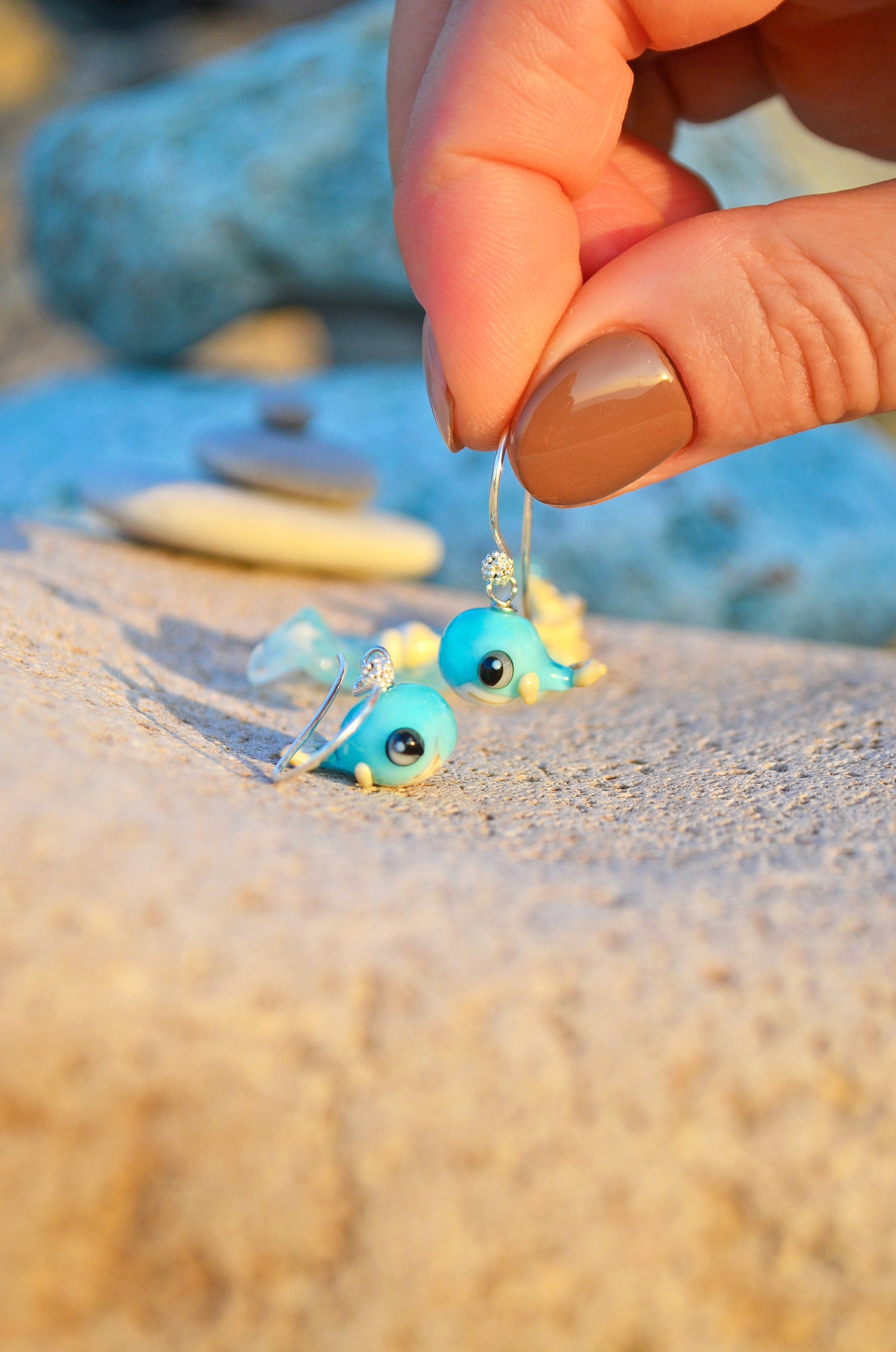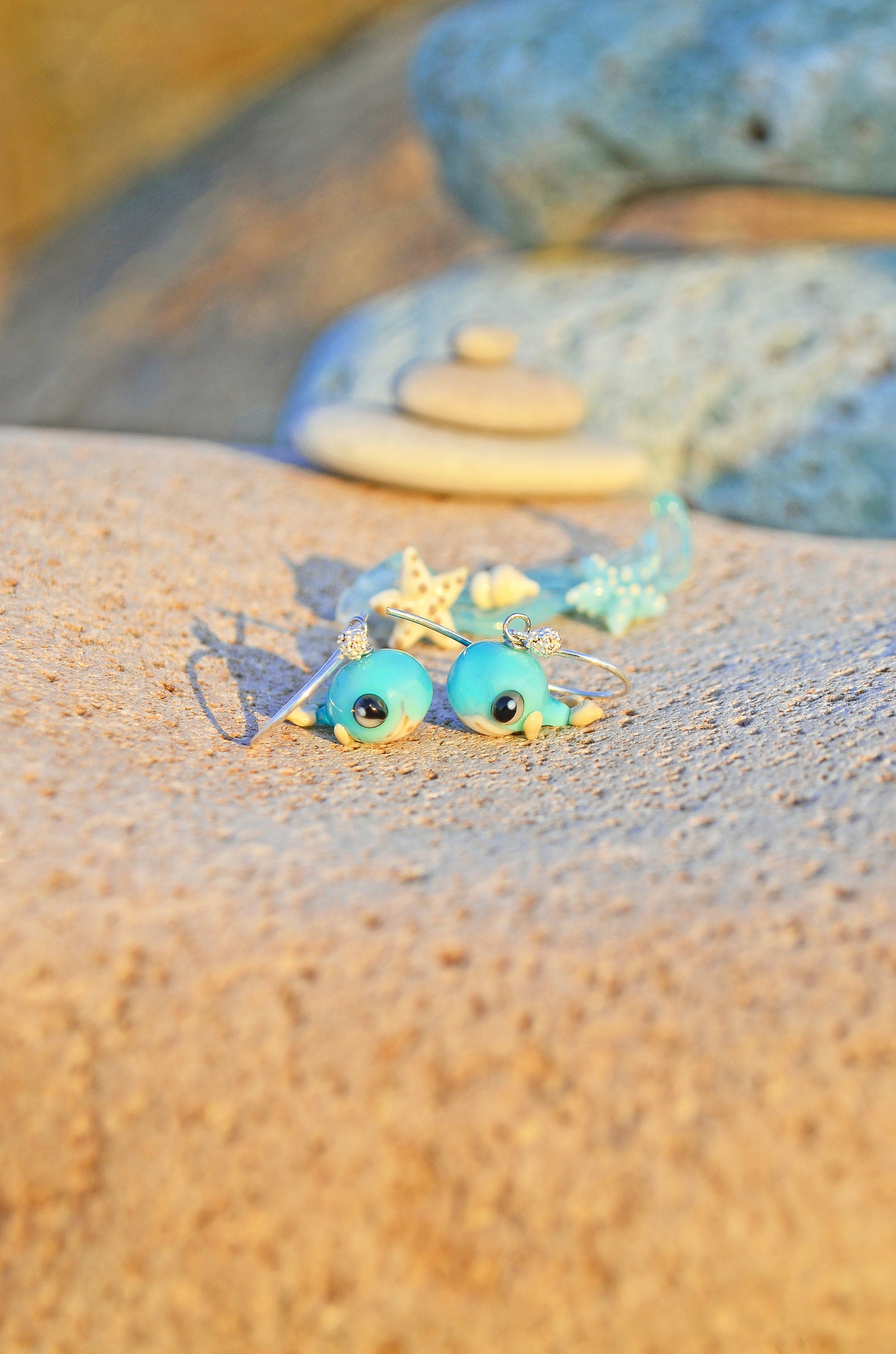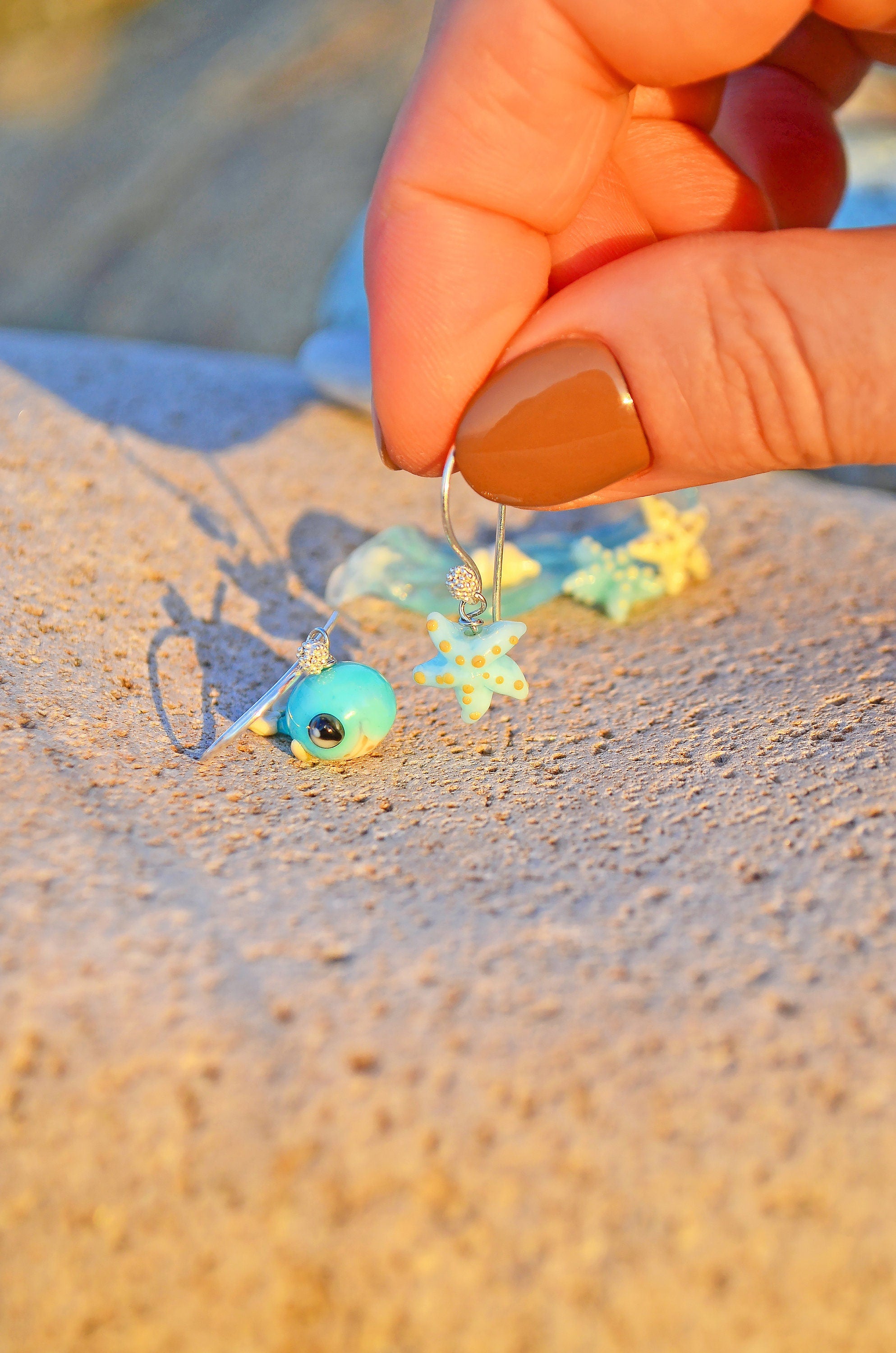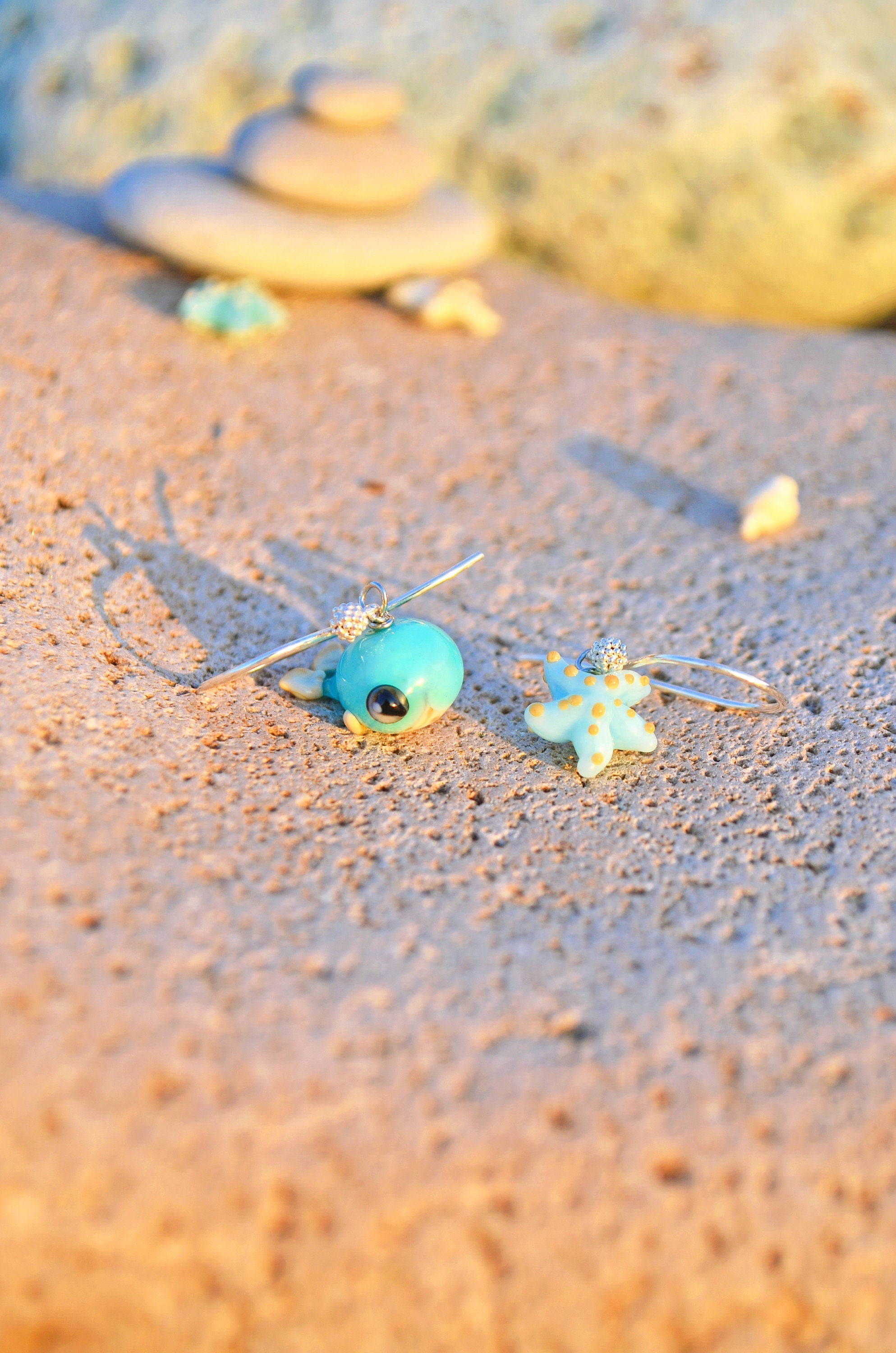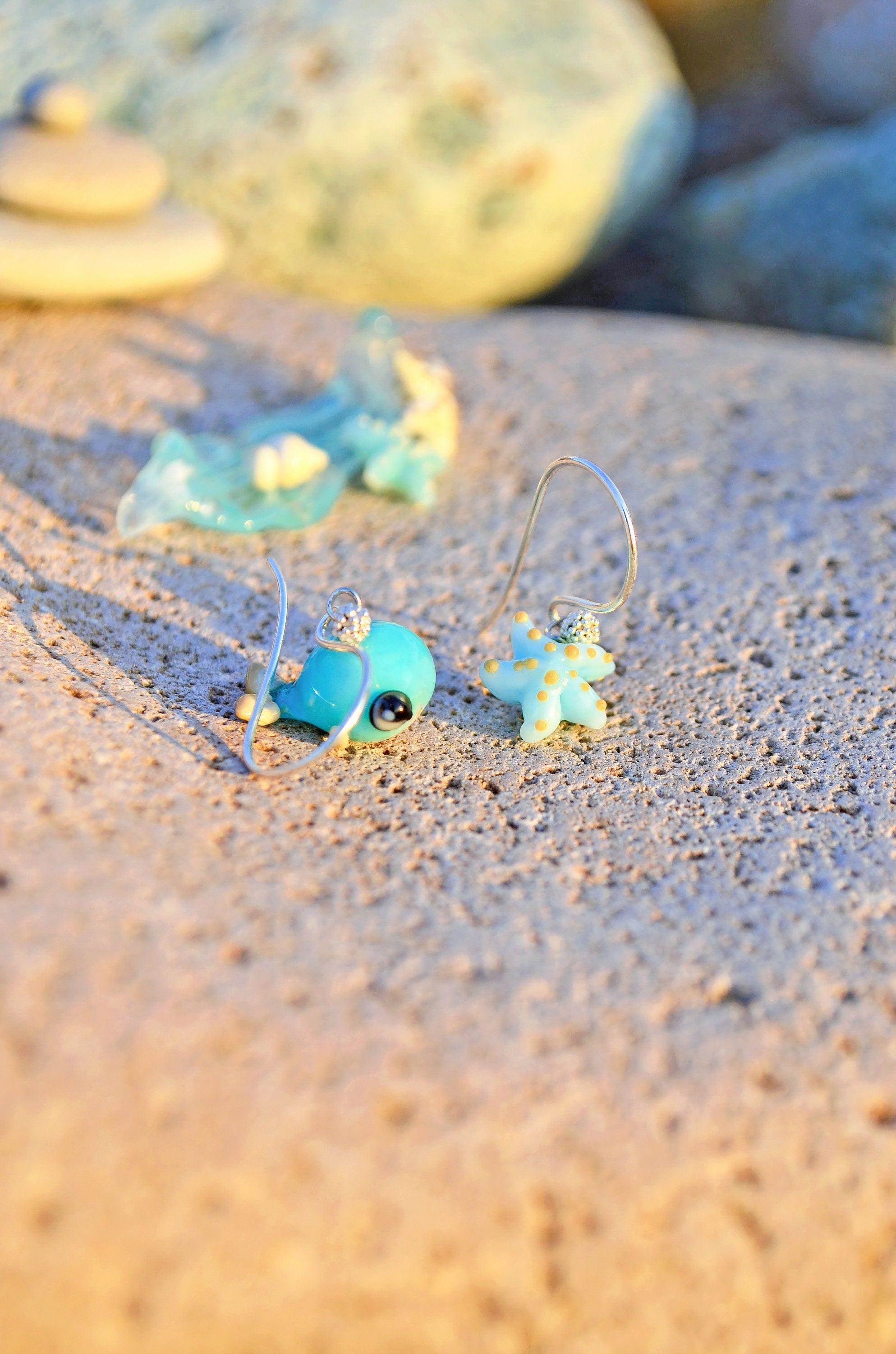 Blue Whale Earrings, Sterling Silver, Murano Glass, Starfish Earrings
