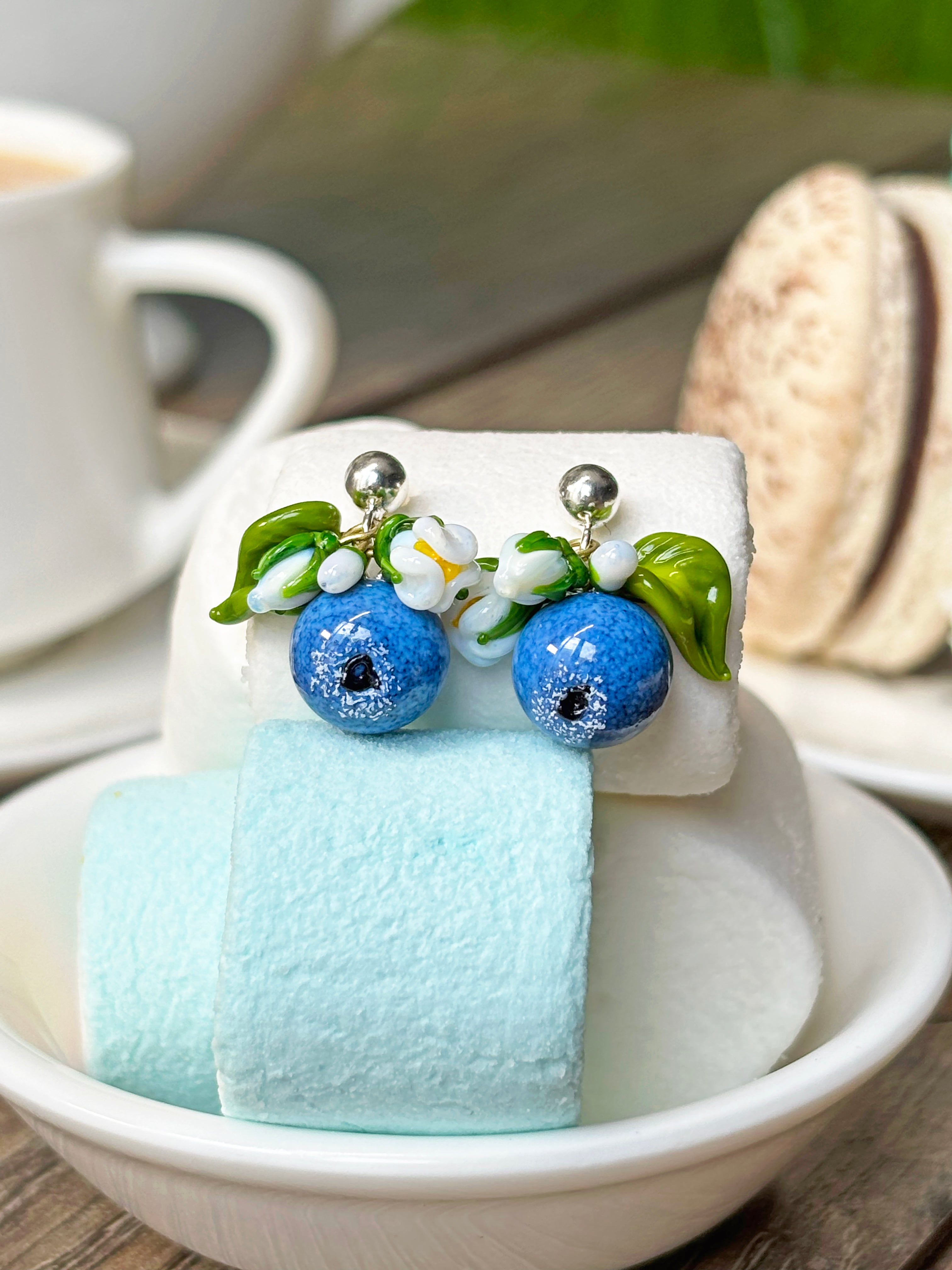Each blueberry and flower in this pair of stud earrings is individually flame-sculpted from Murano and Bohemian glass using the traditional lampwork technique. Every tiny detail — from the petals to the leaves — is shaped by hand in a 1000°C flame, then slowly annealed in a kiln to ensure strength and longevity.