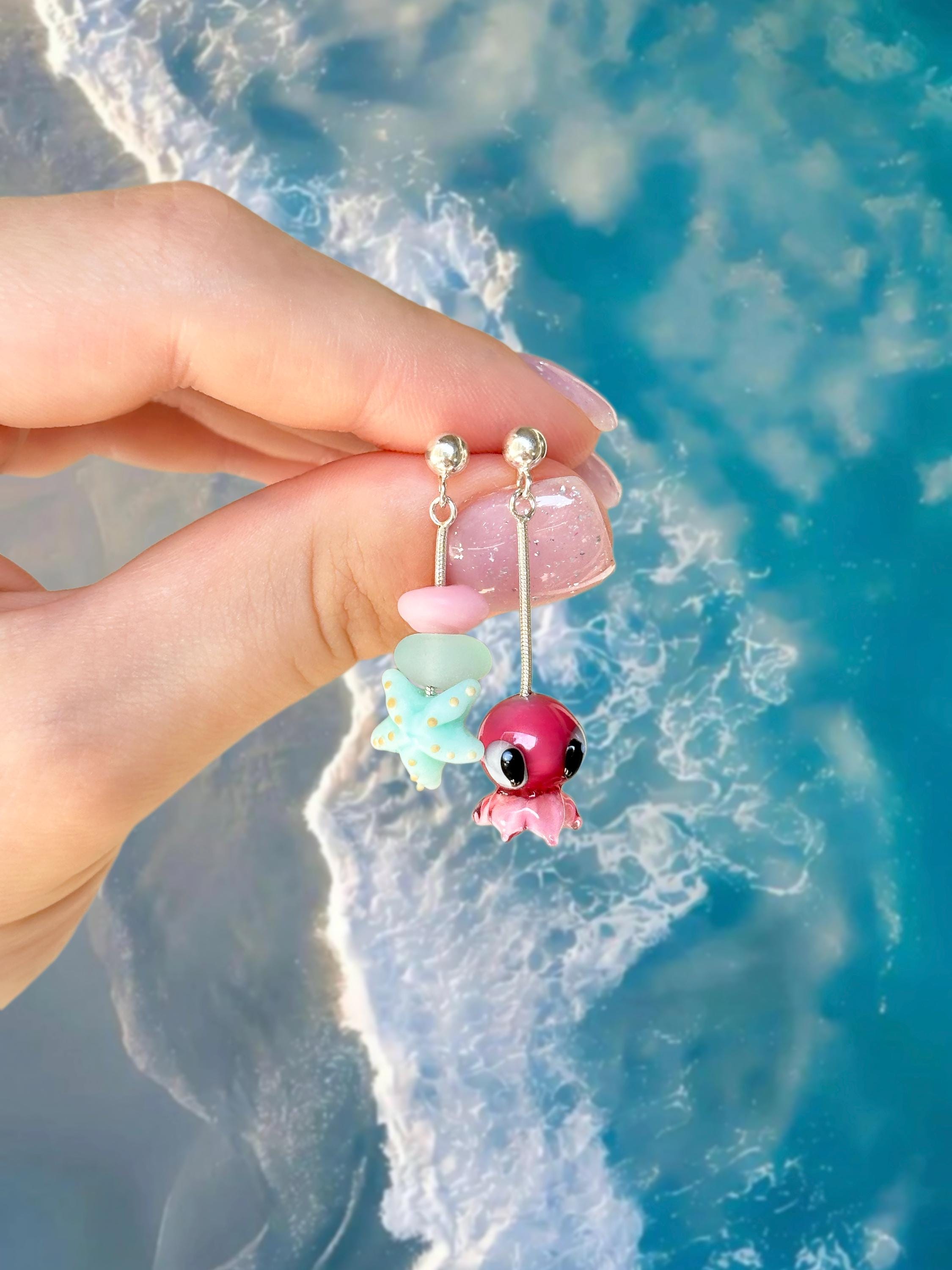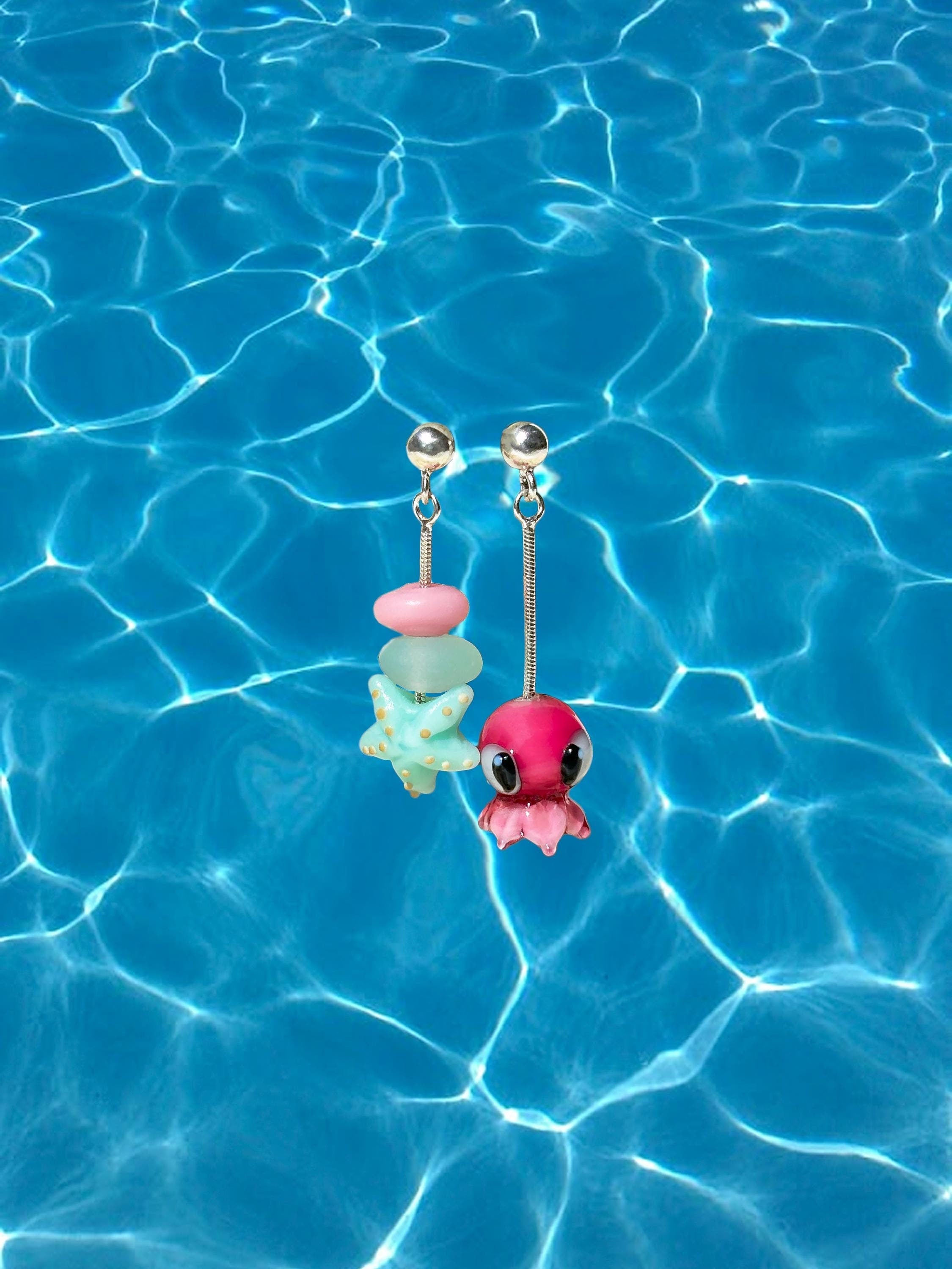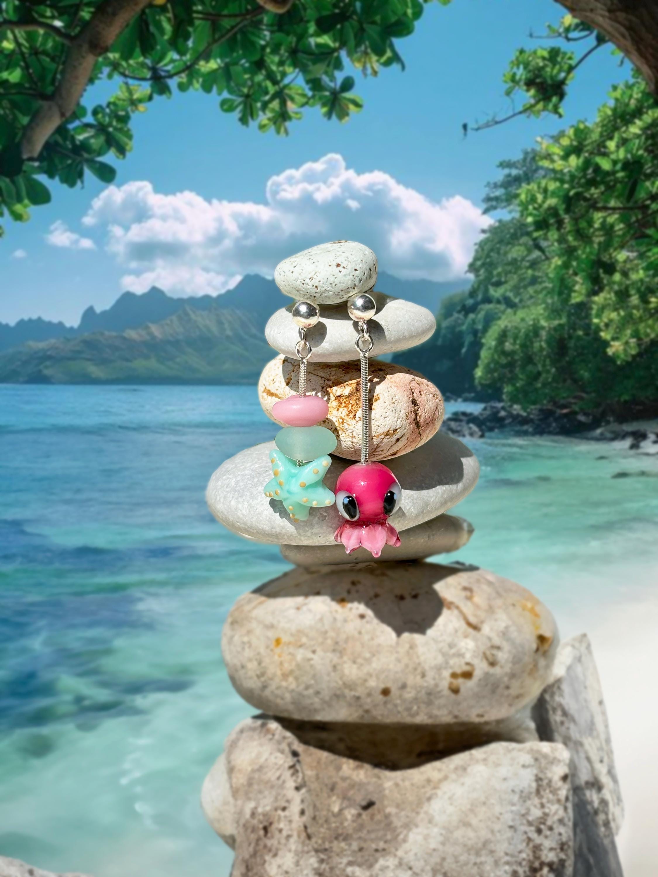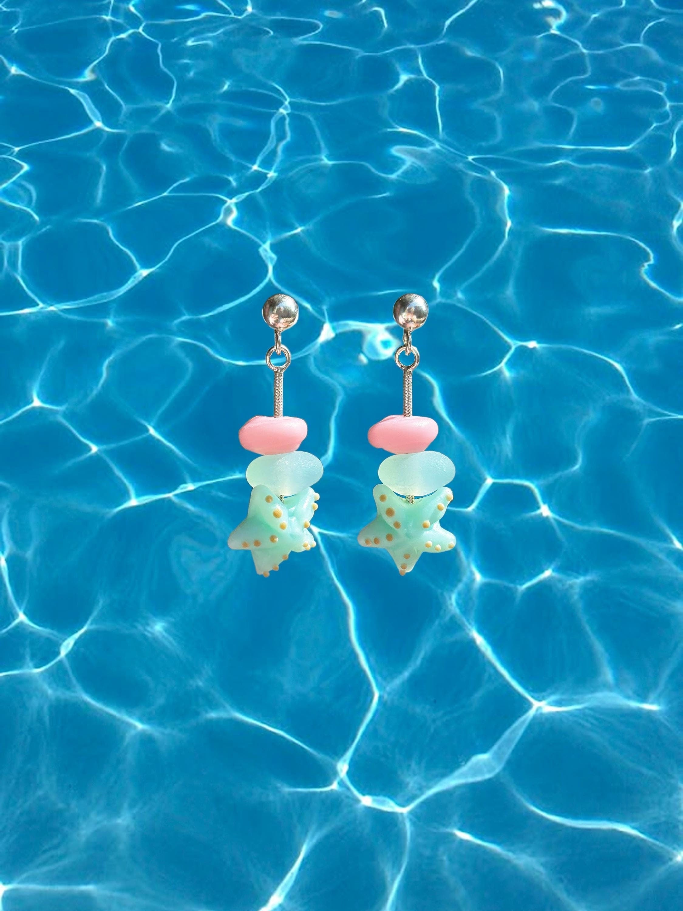 Lucky Starfish Earrings, Handmade, Murano Glass, 925 Sterling Silver, Lampwork