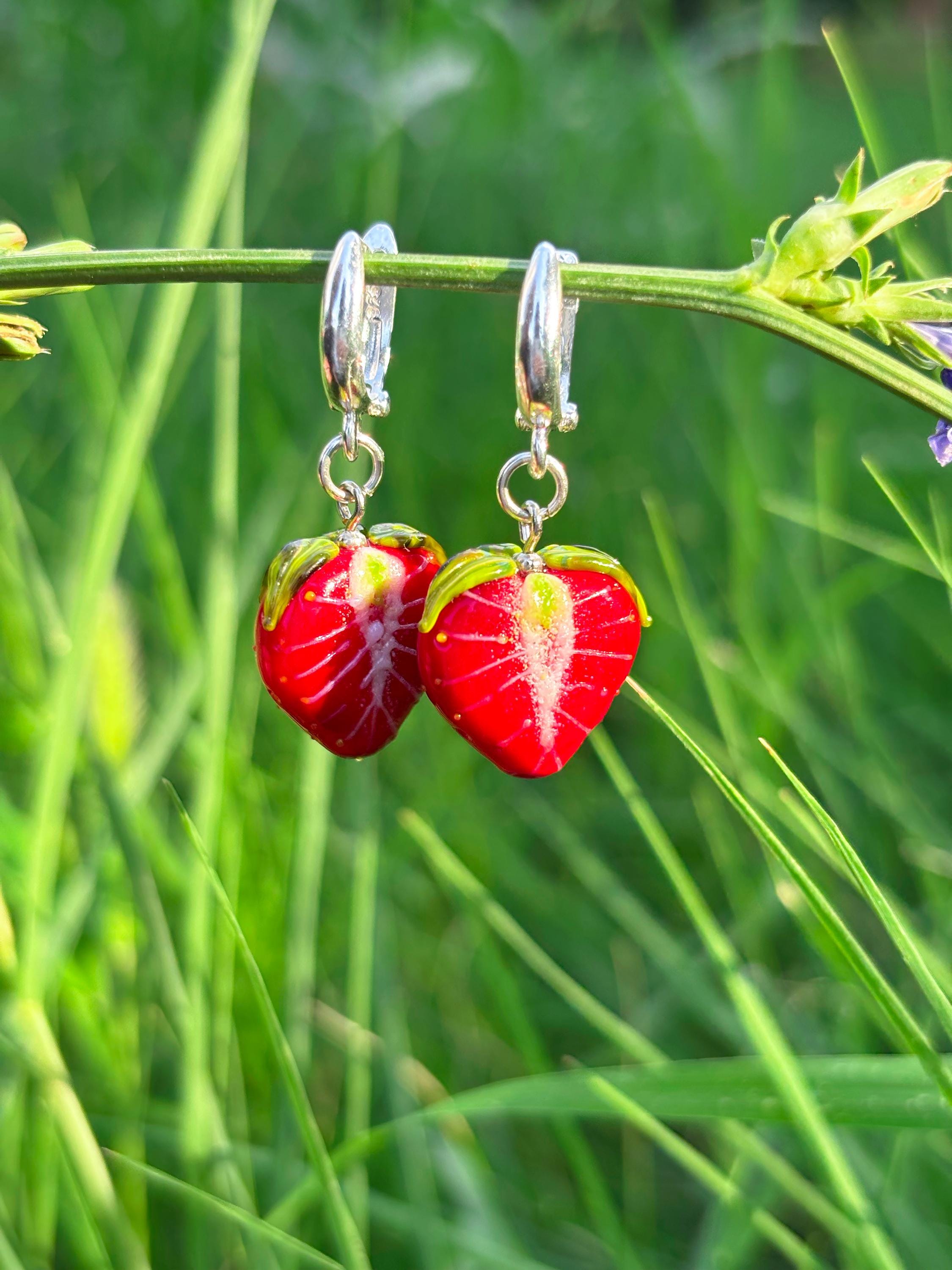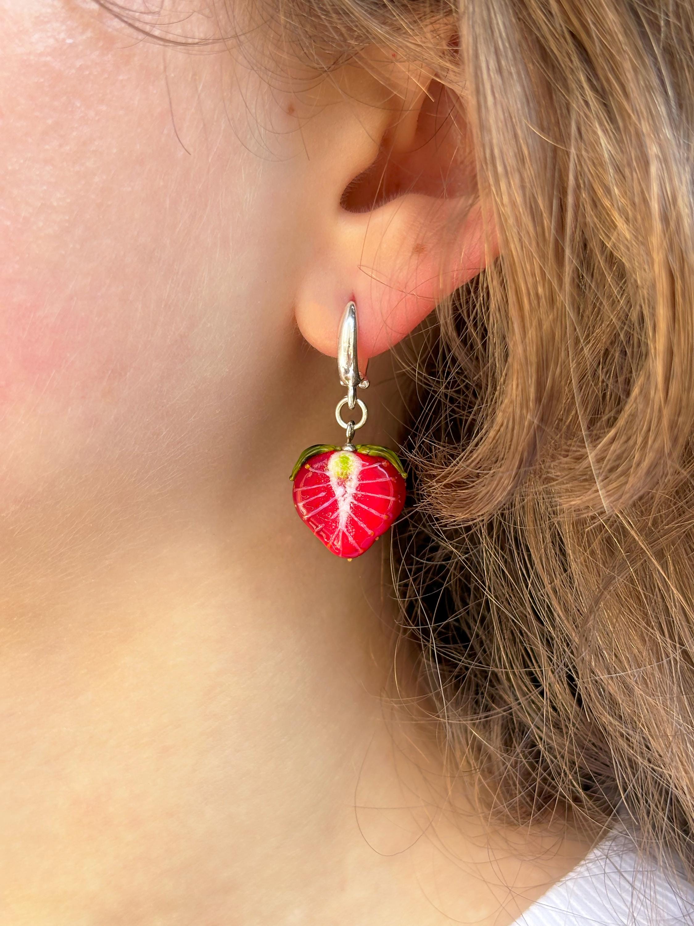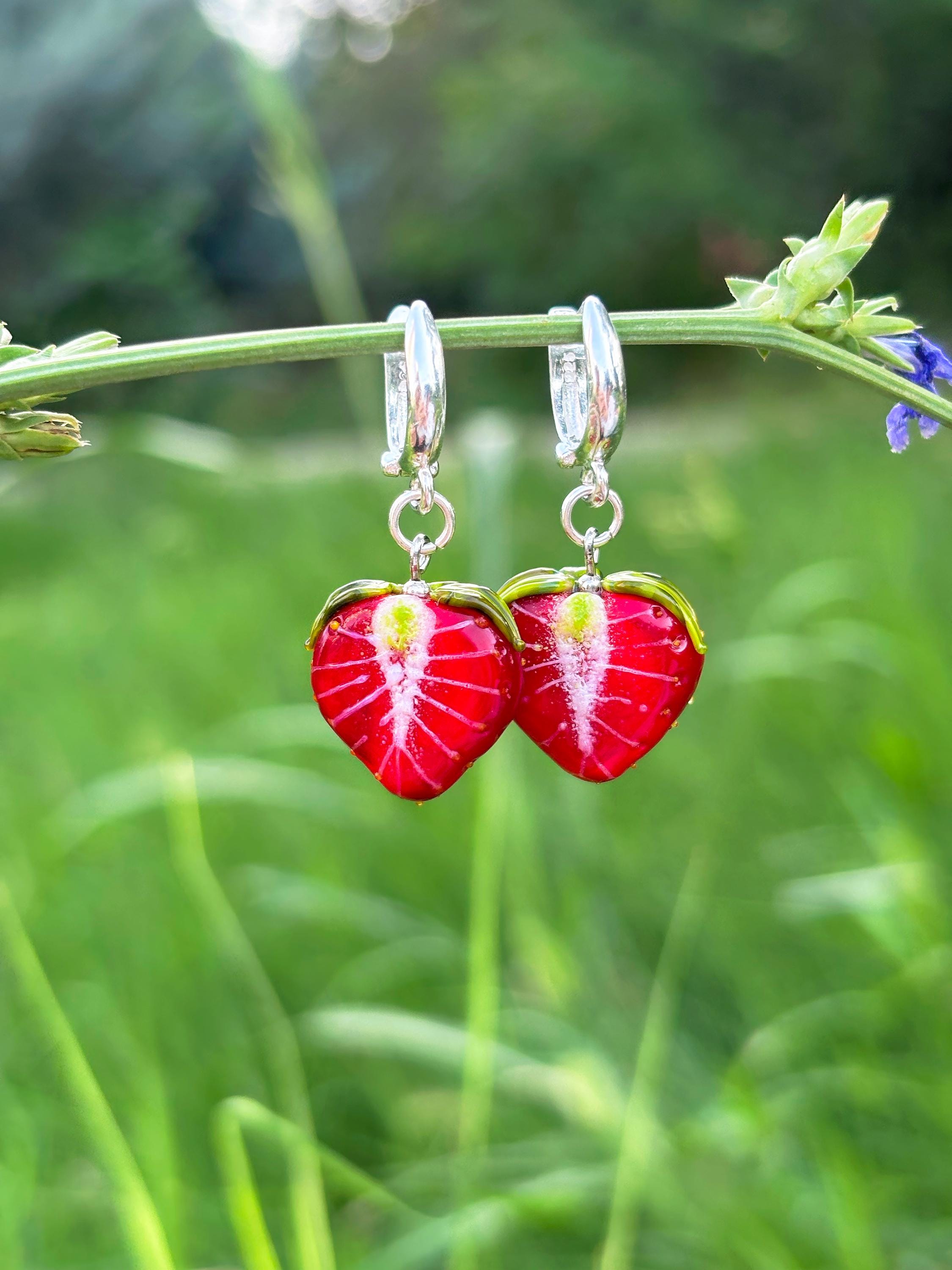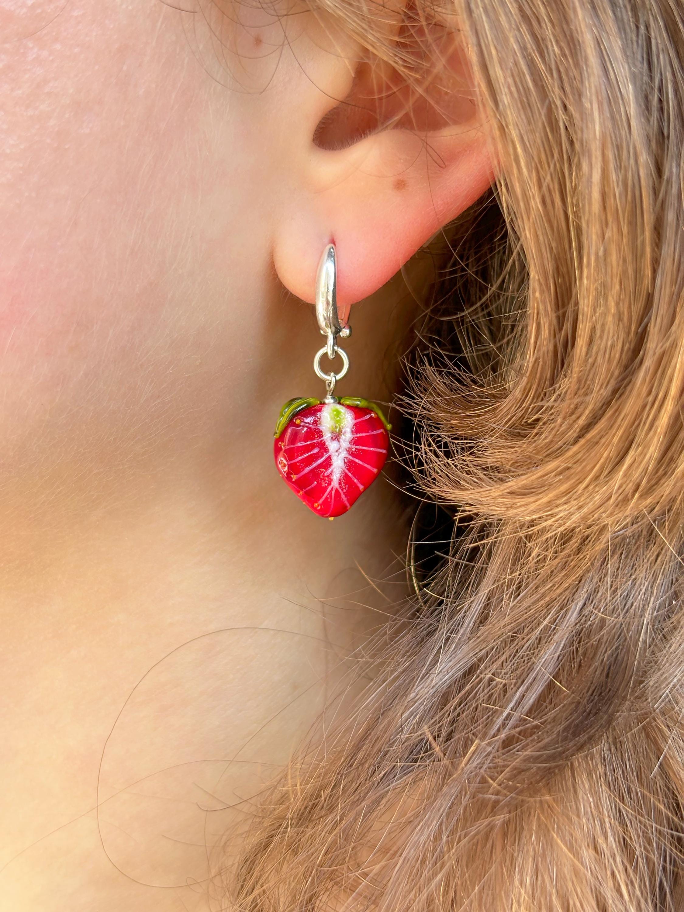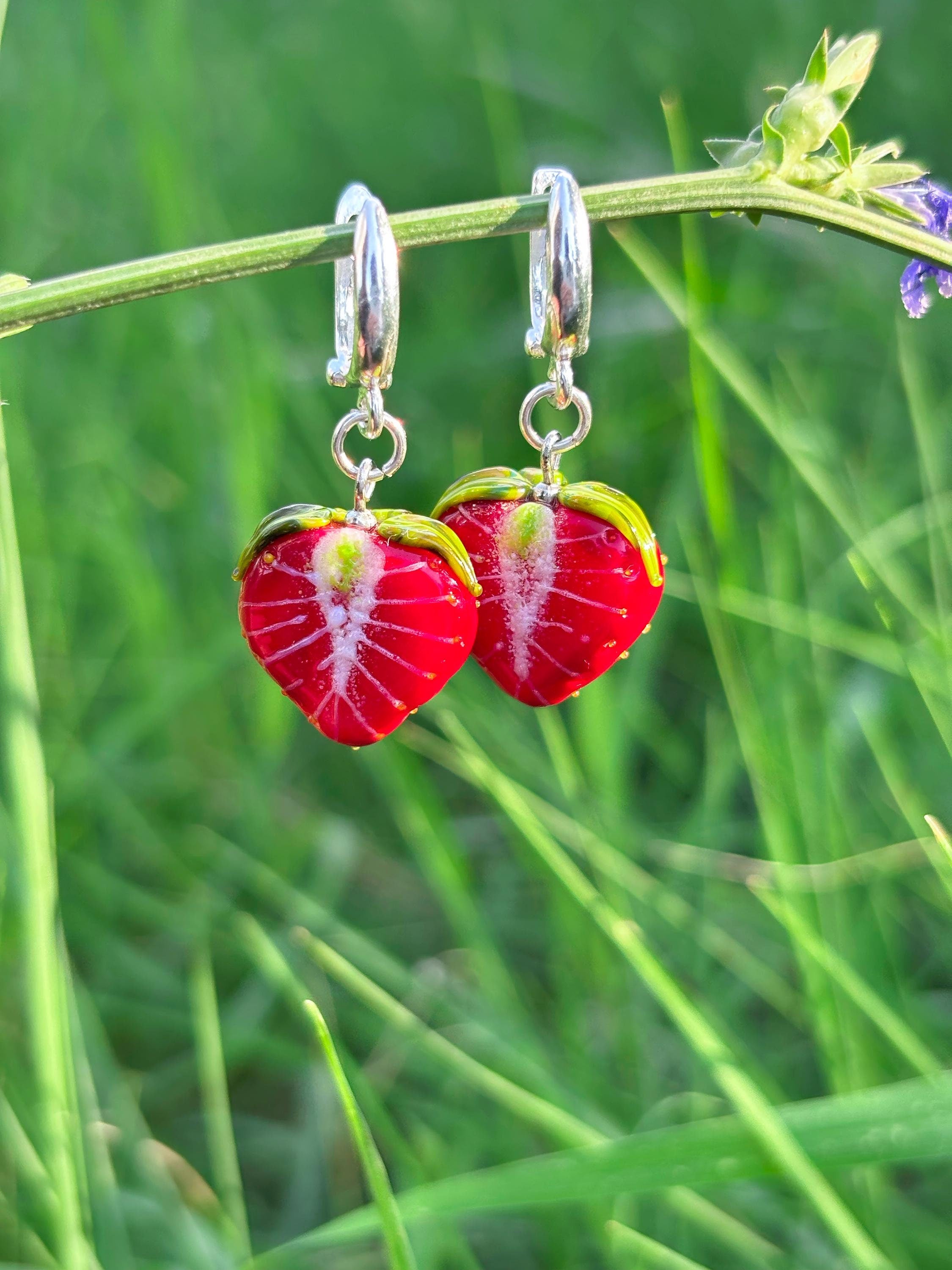 Strawberry Earrings, Glass Berries, Sterling Silver, Murano Glass, Lampwork