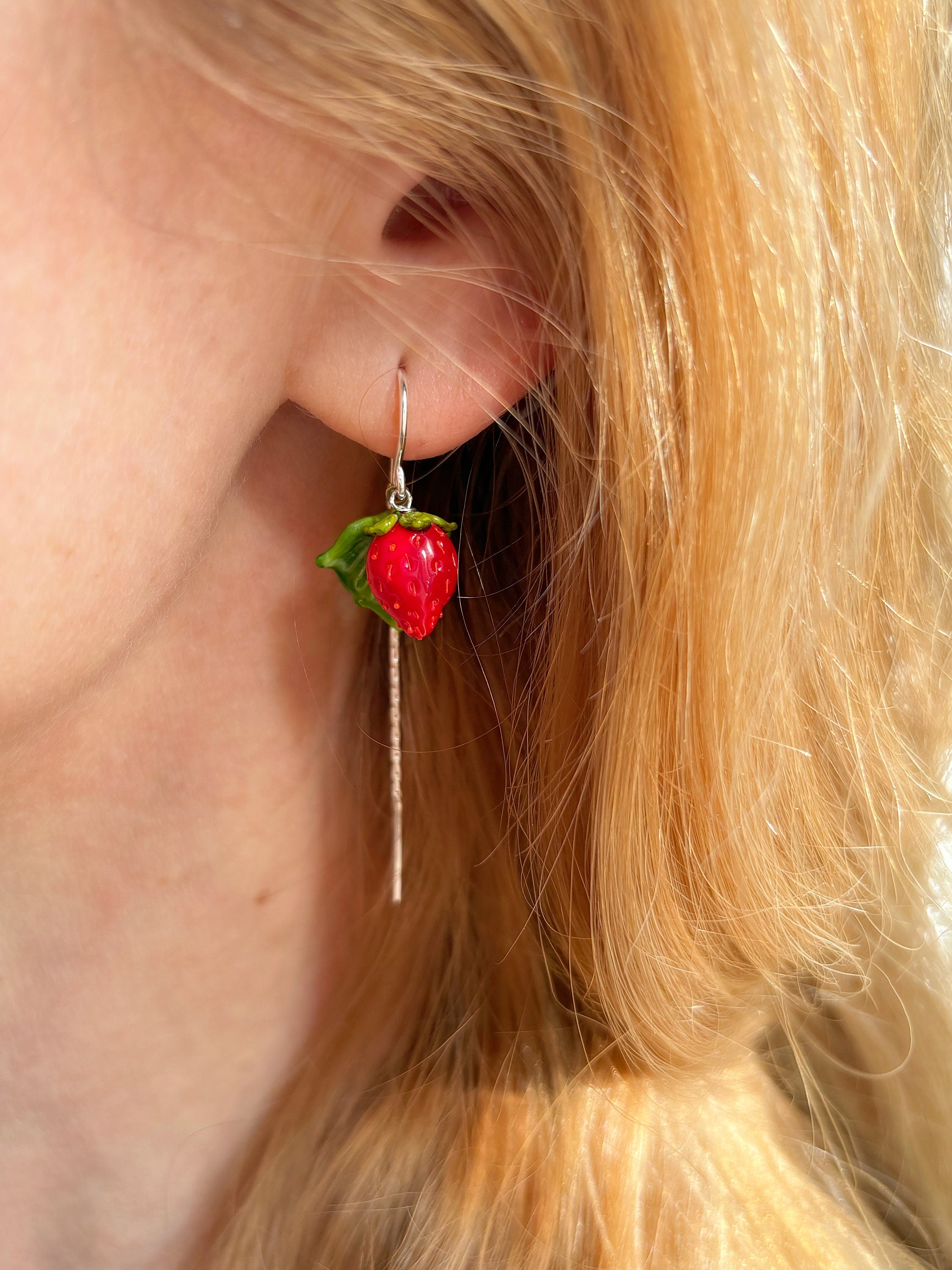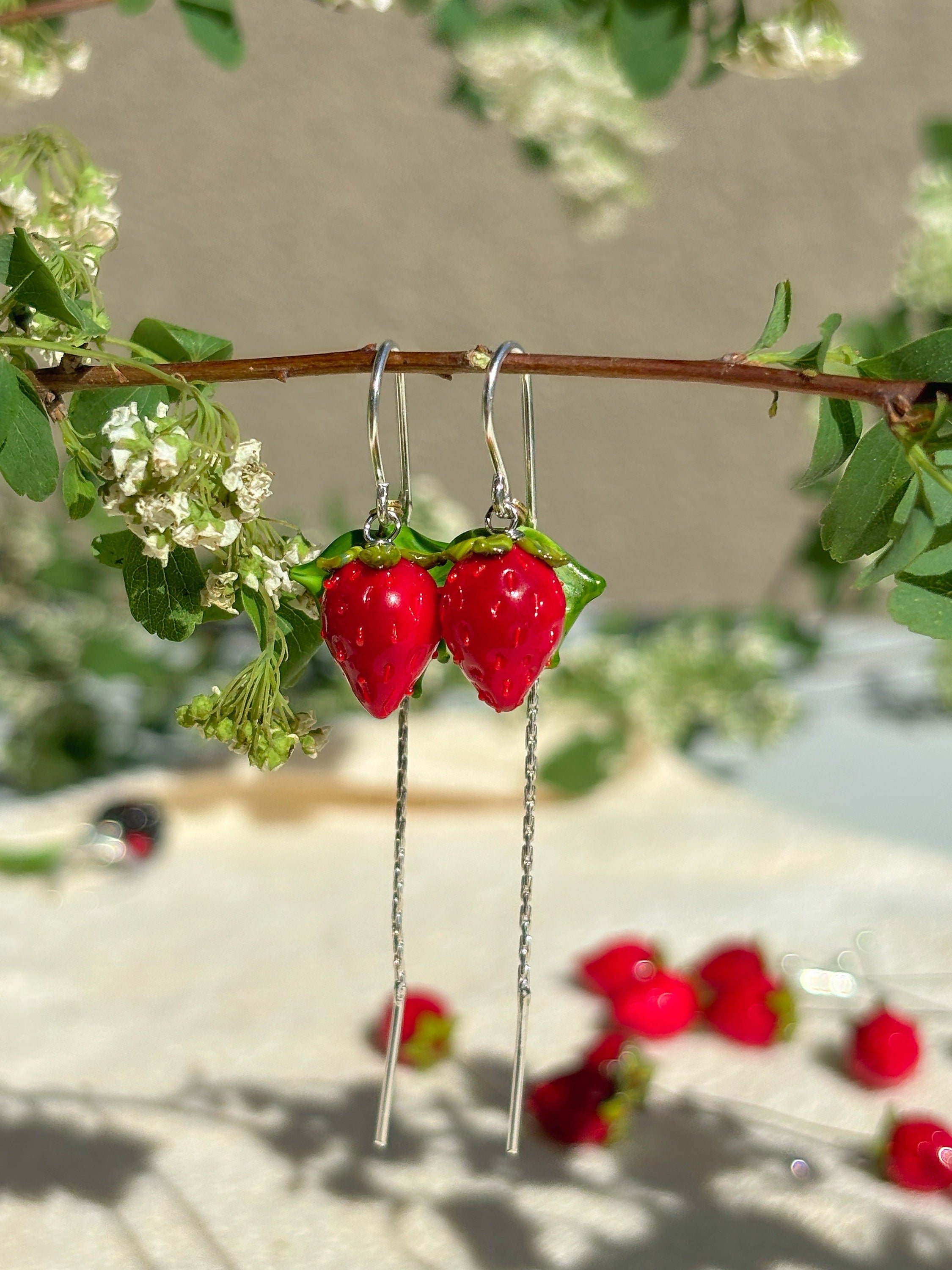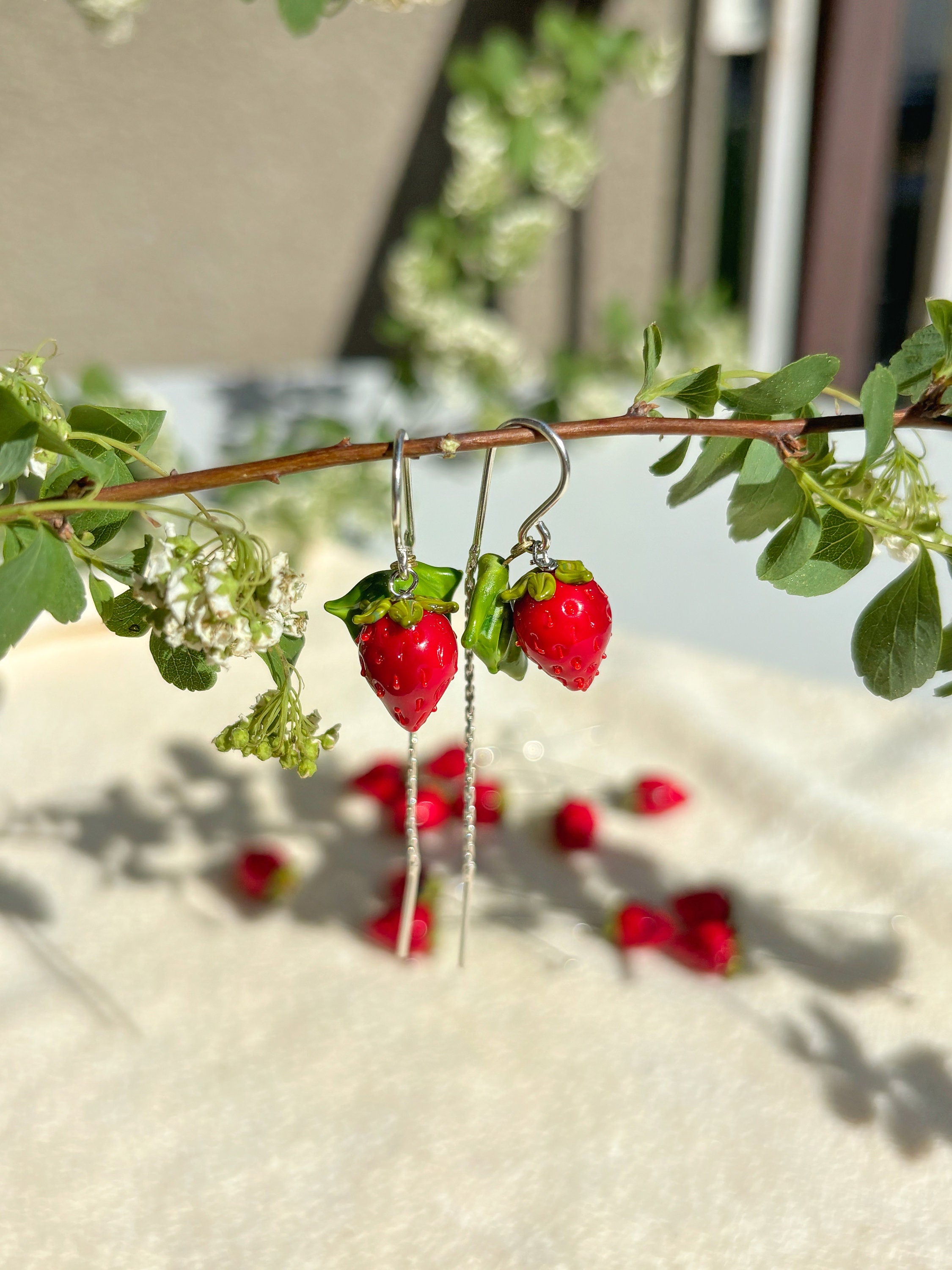 Wild Strawberry Earrings, Dangling Earrings, Murano Glass, Sterling Silver, Lampwork
