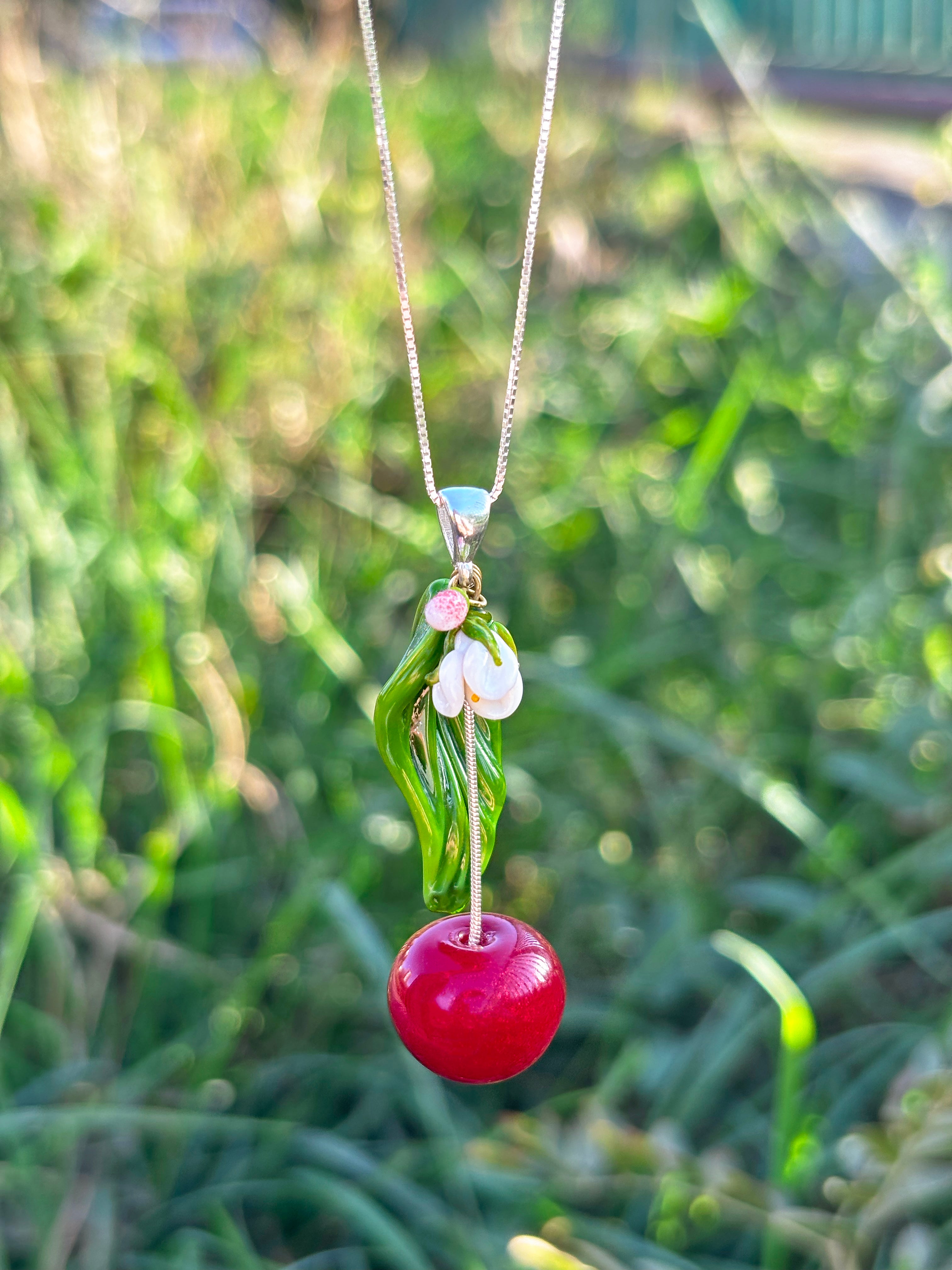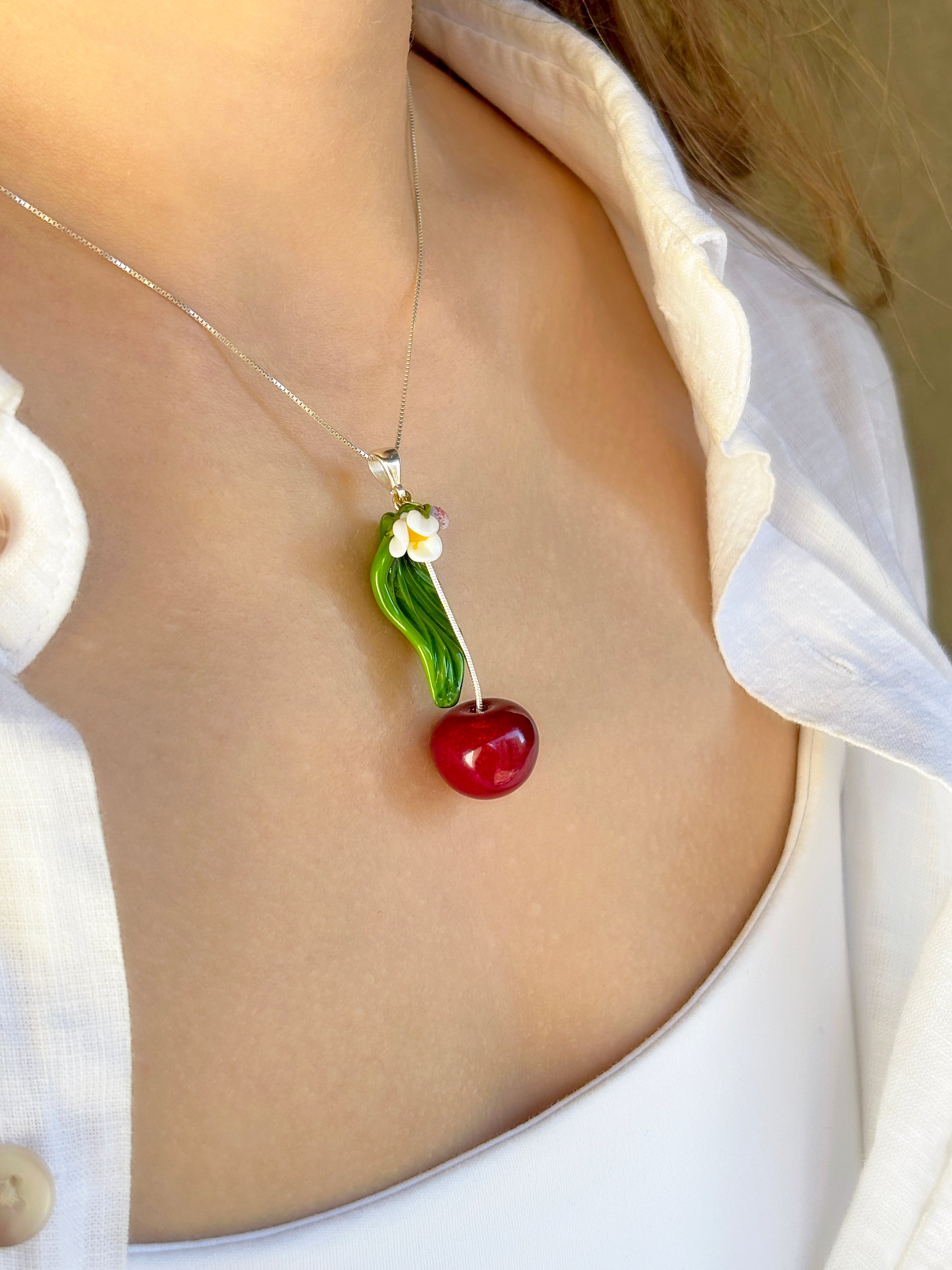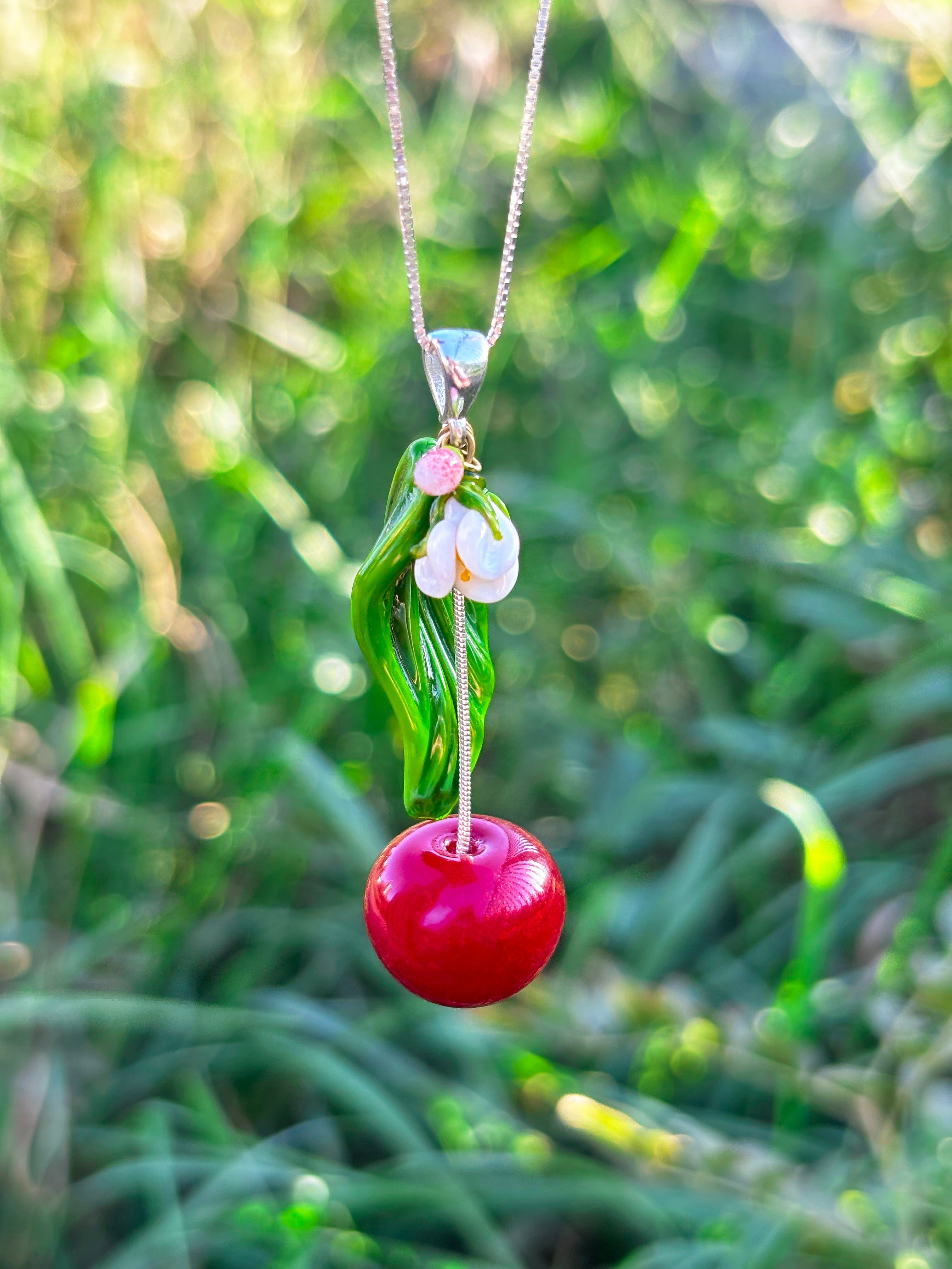 Each glass Cherry takes up to 25 minutes to be handcrafted in an open flame, reaching temperatures of up to 1000 degrees Celsius. After crafting, the beads are placed in a kiln for eight hours to ensure durability and longevity. Following this heating process, the beads are carefully washed by hand to remove them from the mandrel. They are then meticulously cleaned, reamed, and polished to perfection, meaning that each jewelry piece requires around 2-3 days to complete.