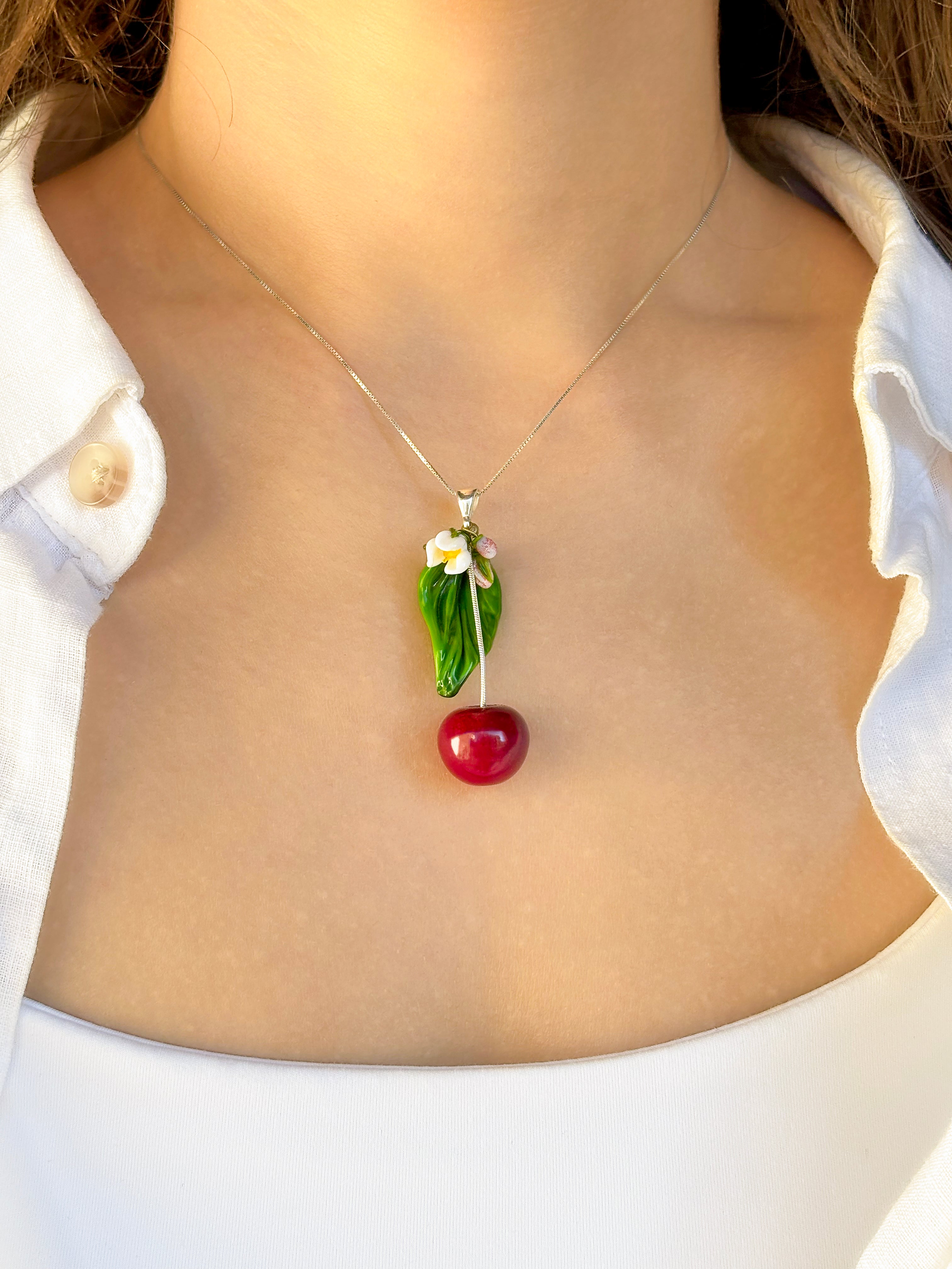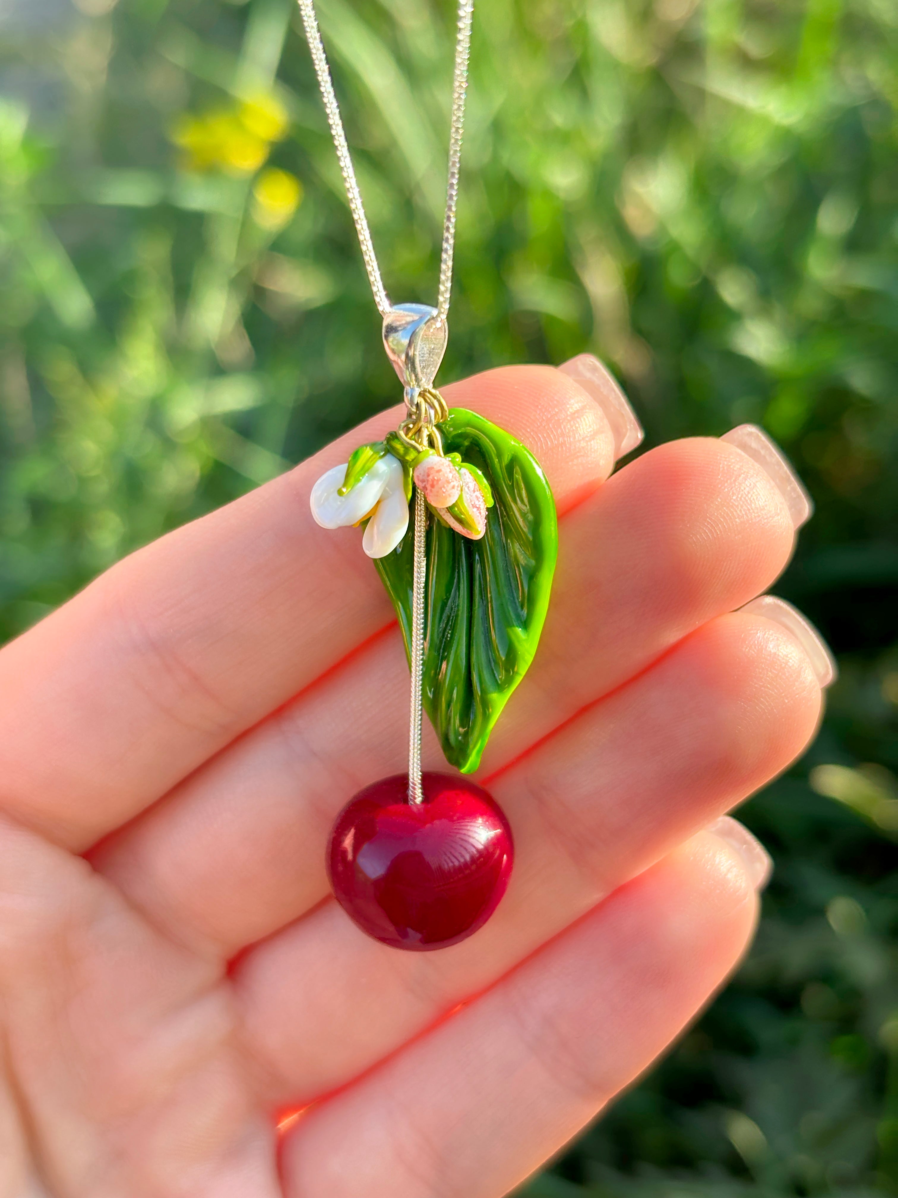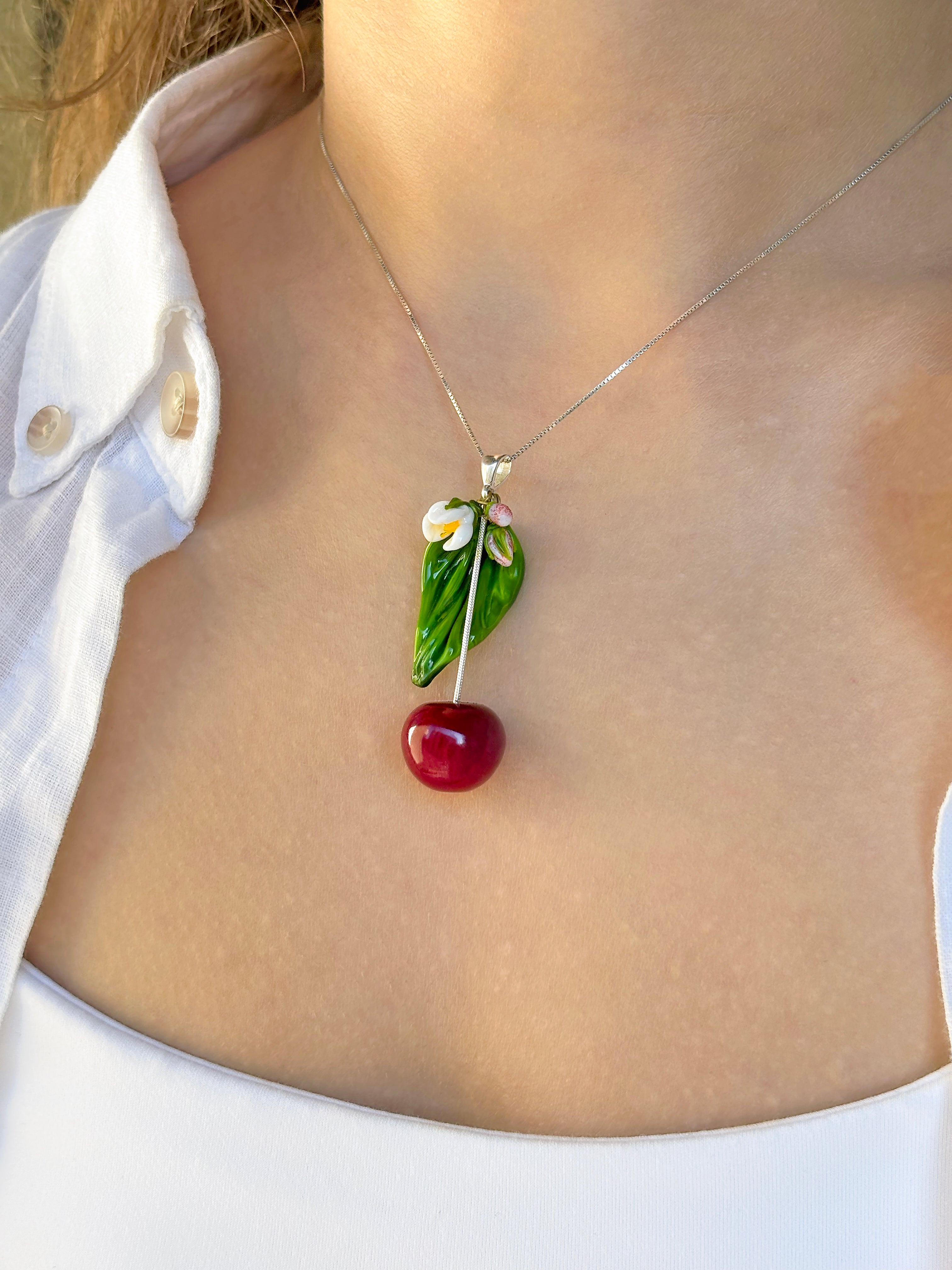Each glass Cherry takes up to 25 minutes to be handcrafted in an open flame, reaching temperatures of up to 1000 degrees Celsius. After crafting, the beads are placed in a kiln for eight hours to ensure durability and longevity. Following this heating process, the beads are carefully washed by hand to remove them from the mandrel. They are then meticulously cleaned, reamed, and polished to perfection, meaning that each jewelry piece requires around 2-3 days to complete.