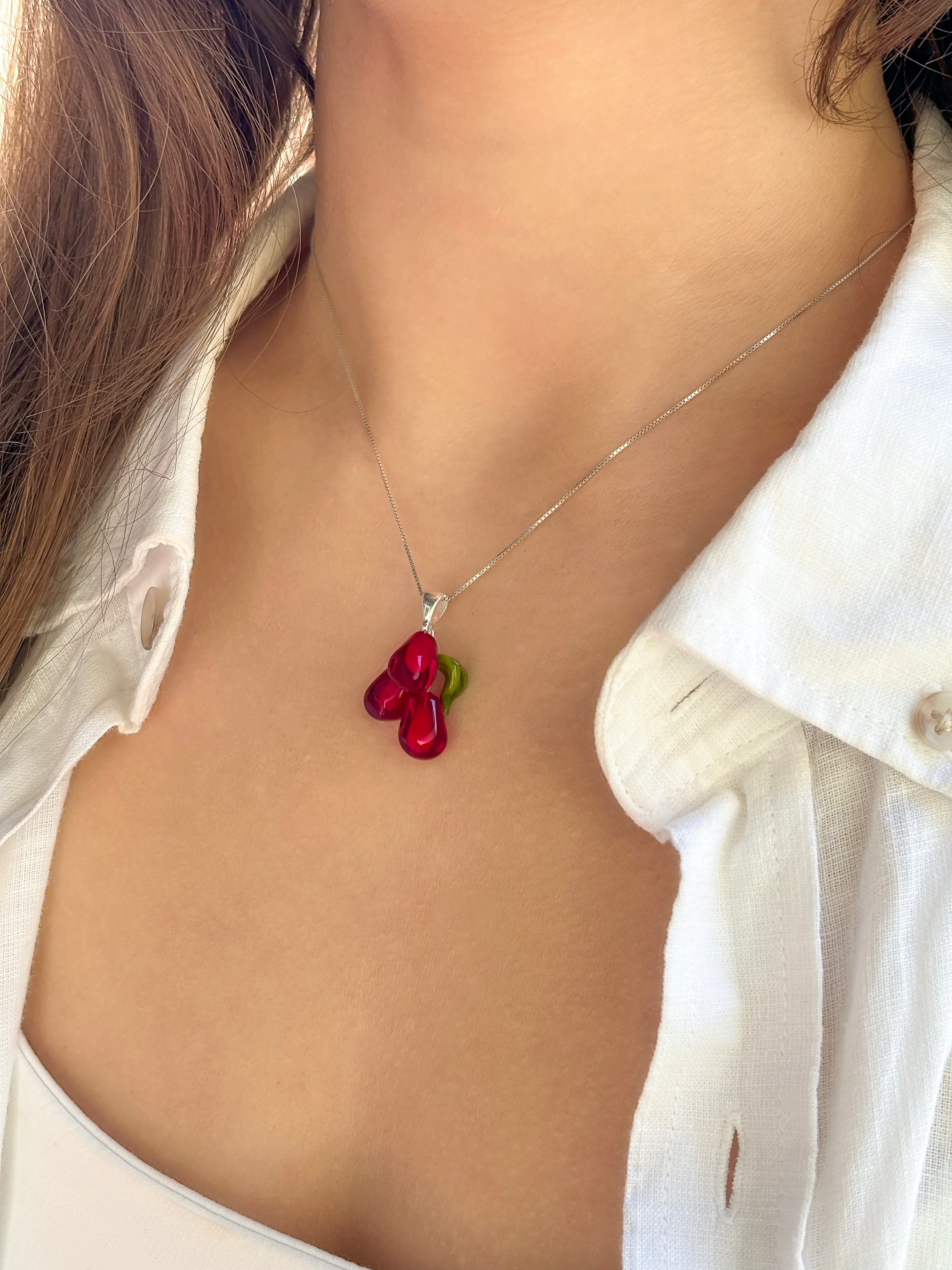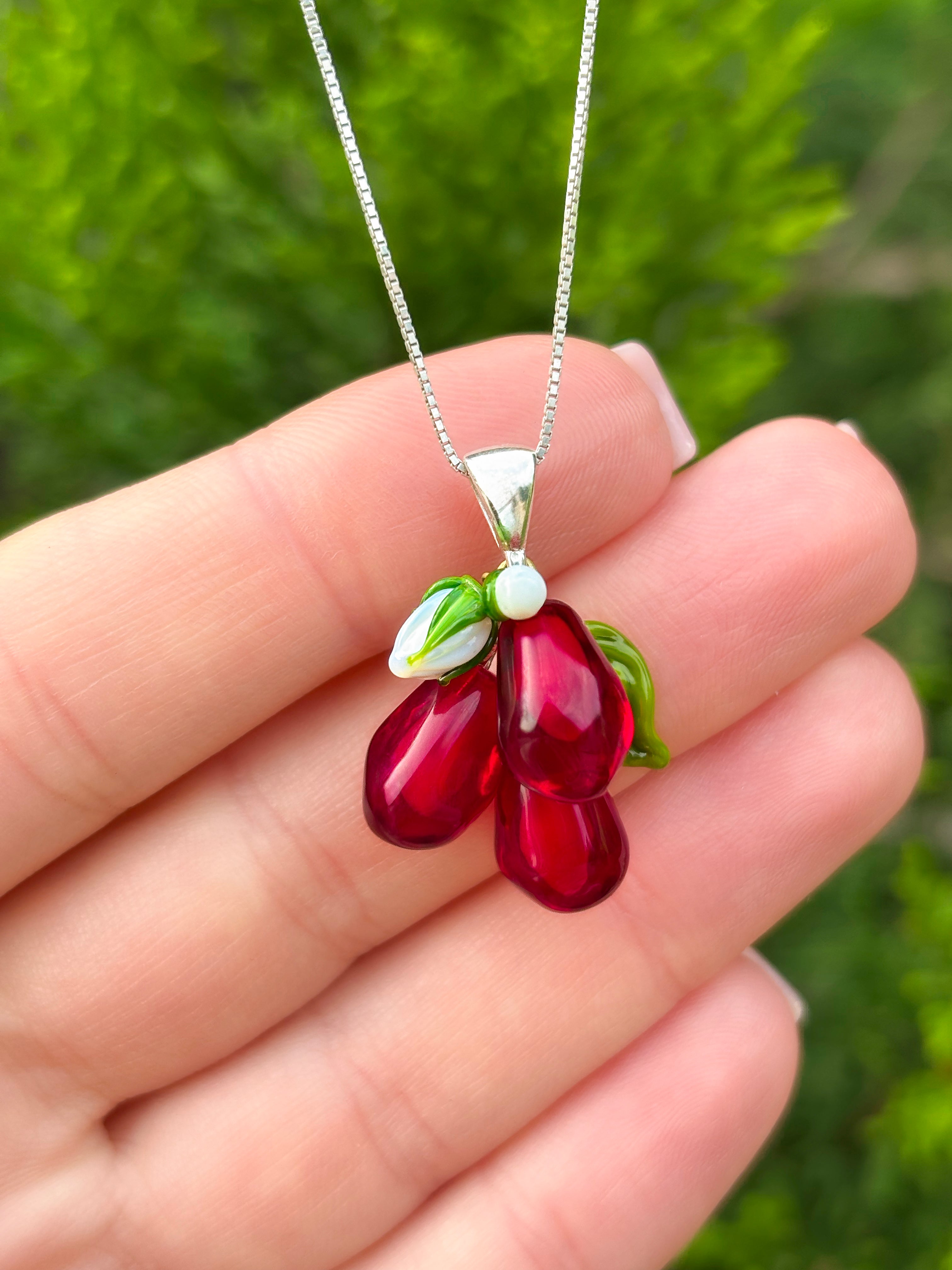 Each glass pomegranate seed is lovingly handcrafted in an open flame, taking up to 15 minutes and reaching temperatures of up to 1000 degrees Celsius. After crafting, the beads are placed in a kiln for eight hours to ensure their durability and longevity. Following this heating process, each bead is carefully washed by hand to remove it from the mandrel, and then meticulously cleaned and polished to perfection. The entire process, including a 24-hour metal adhesion phase for the elements that hold the beads, means that each piece of jewelry requires around 3-5 days to complete.