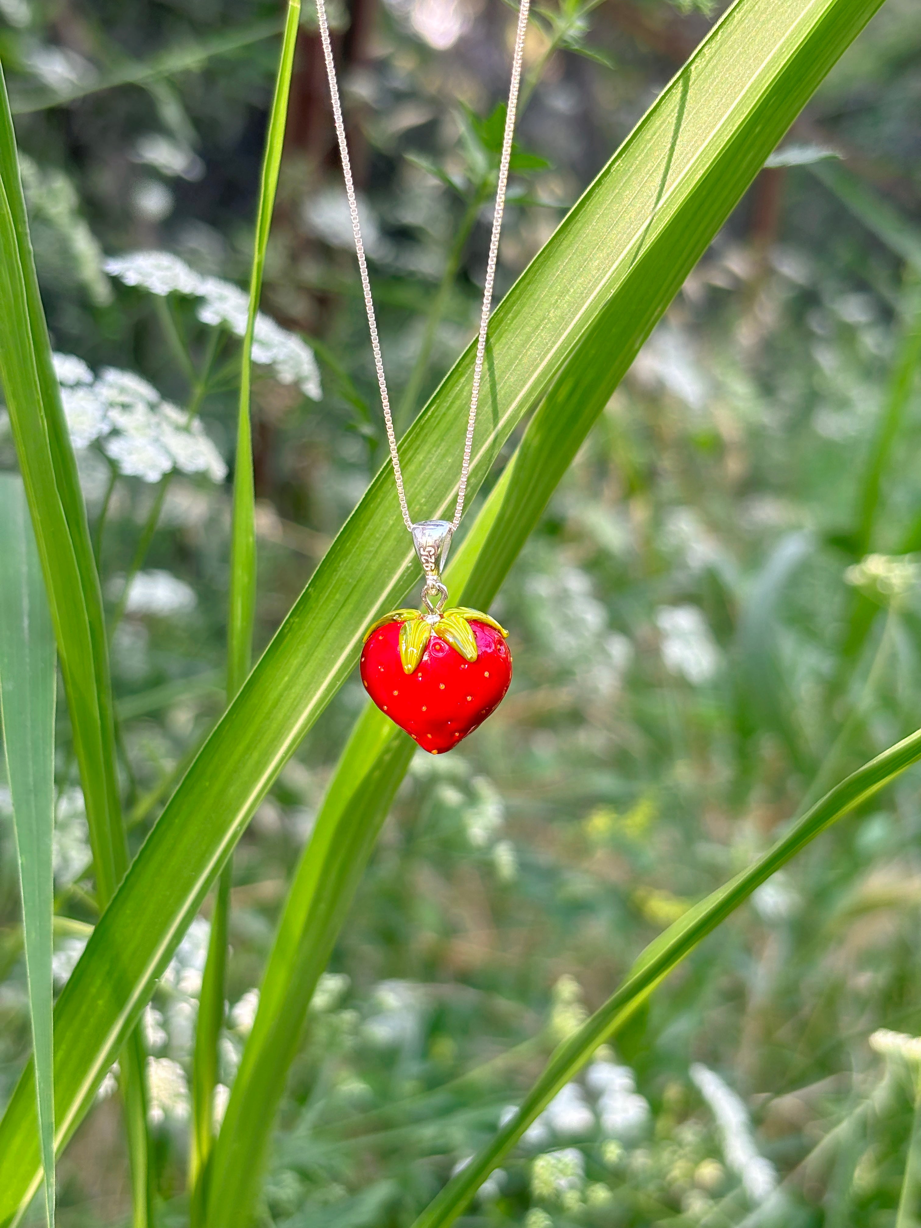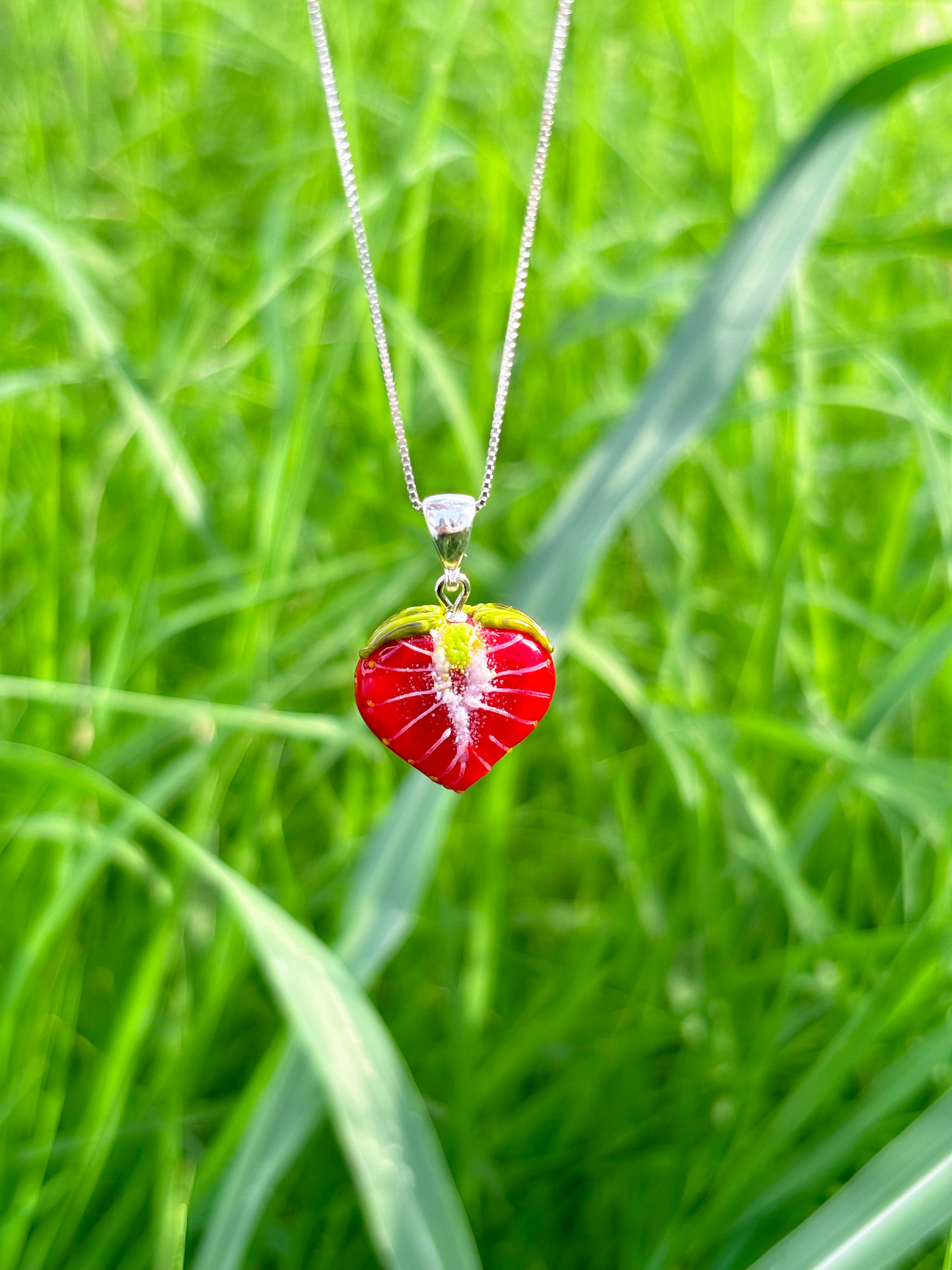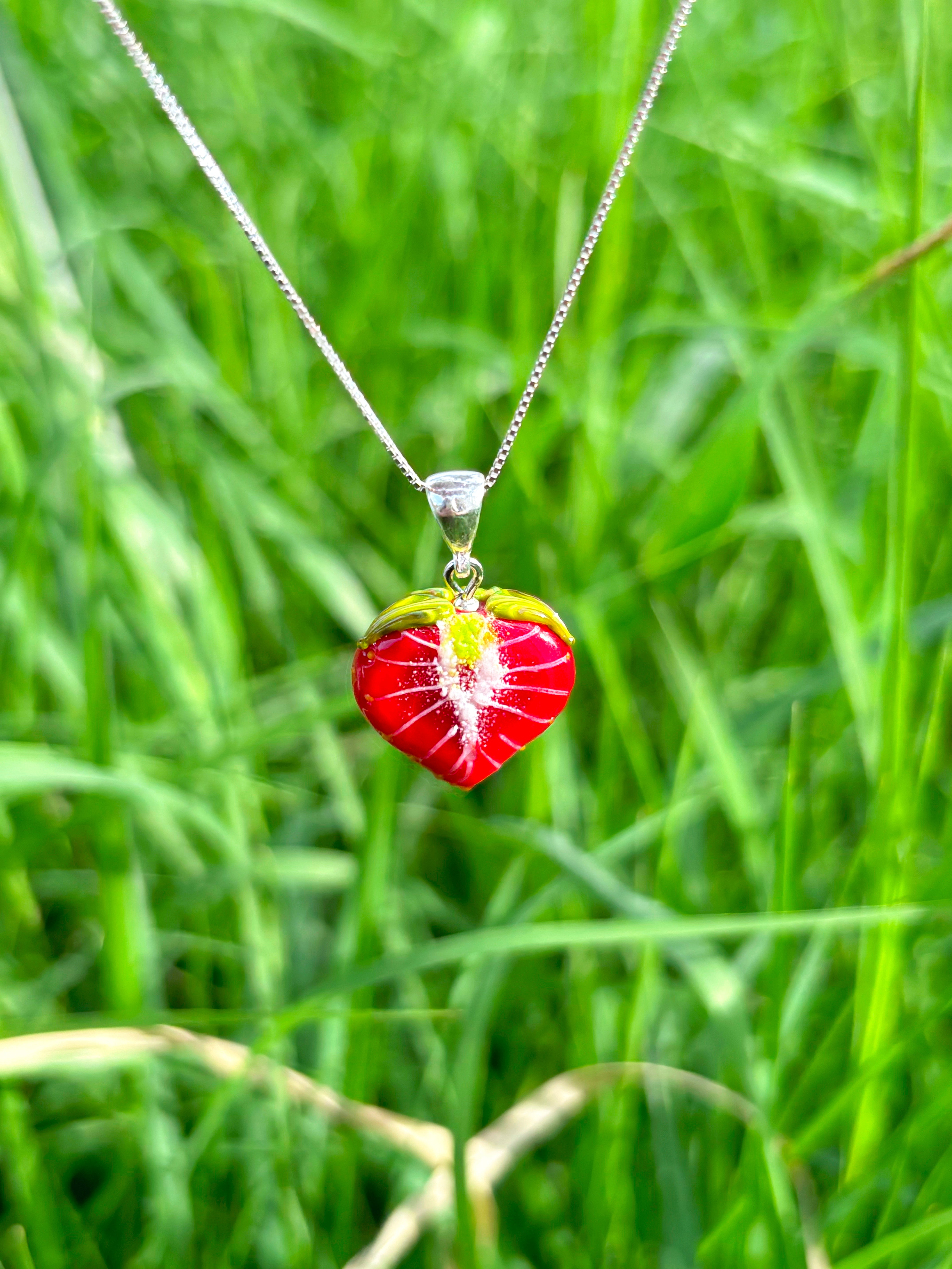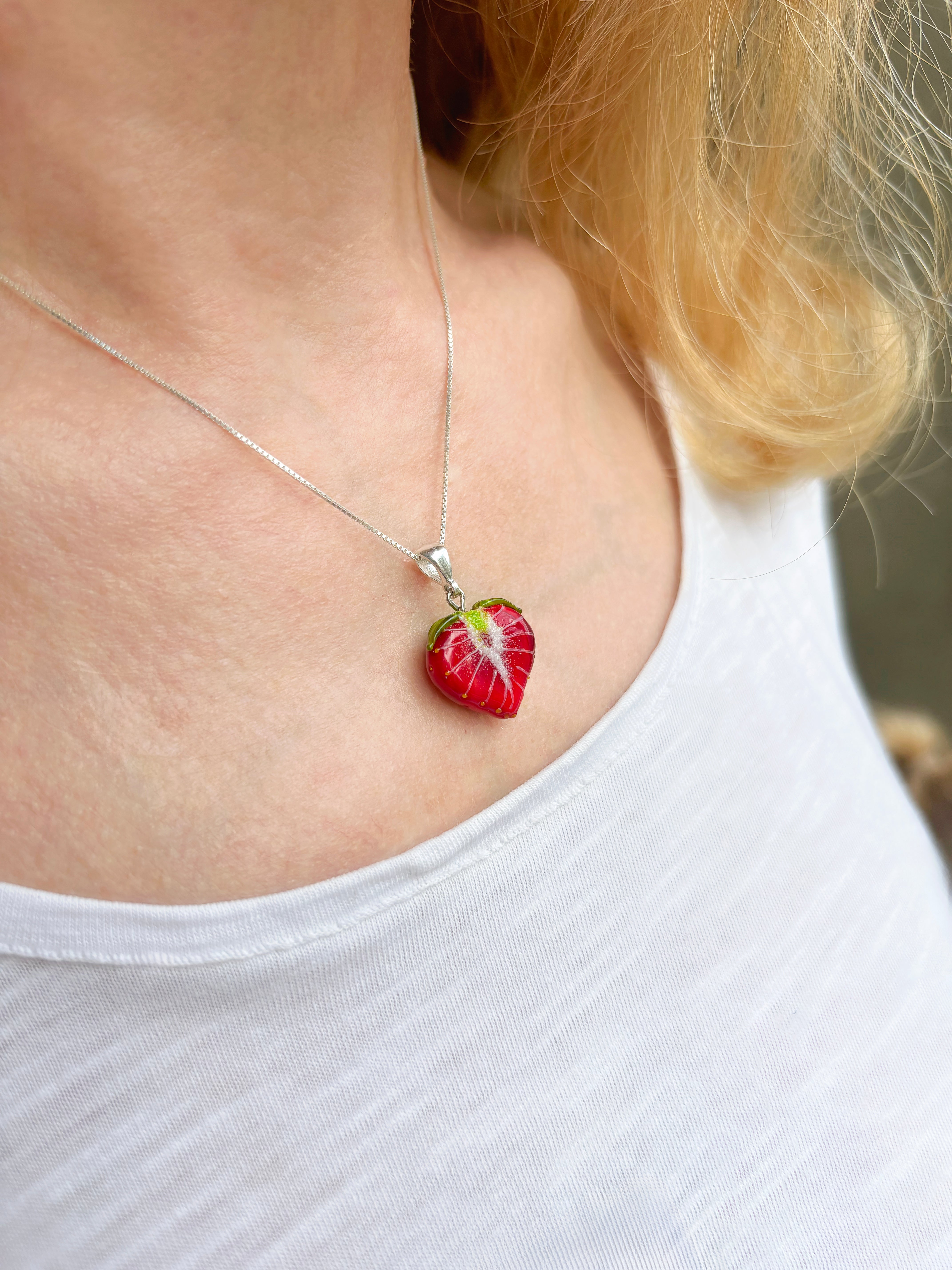 Each glass Strawberry takes up to 75 minutes to be handcrafted in an open flame, reaching temperatures of up to 1000 degrees Celsius. After crafting, the beads are placed in a kiln for eight hours to ensure durability and longevity. Following this heating process, the beads are carefully washed by hand to remove them from the mandrel. They are then meticulously cleaned, reamed, and polished to perfection, meaning that each jewelry piece requires around 2-3 days to complete.
