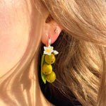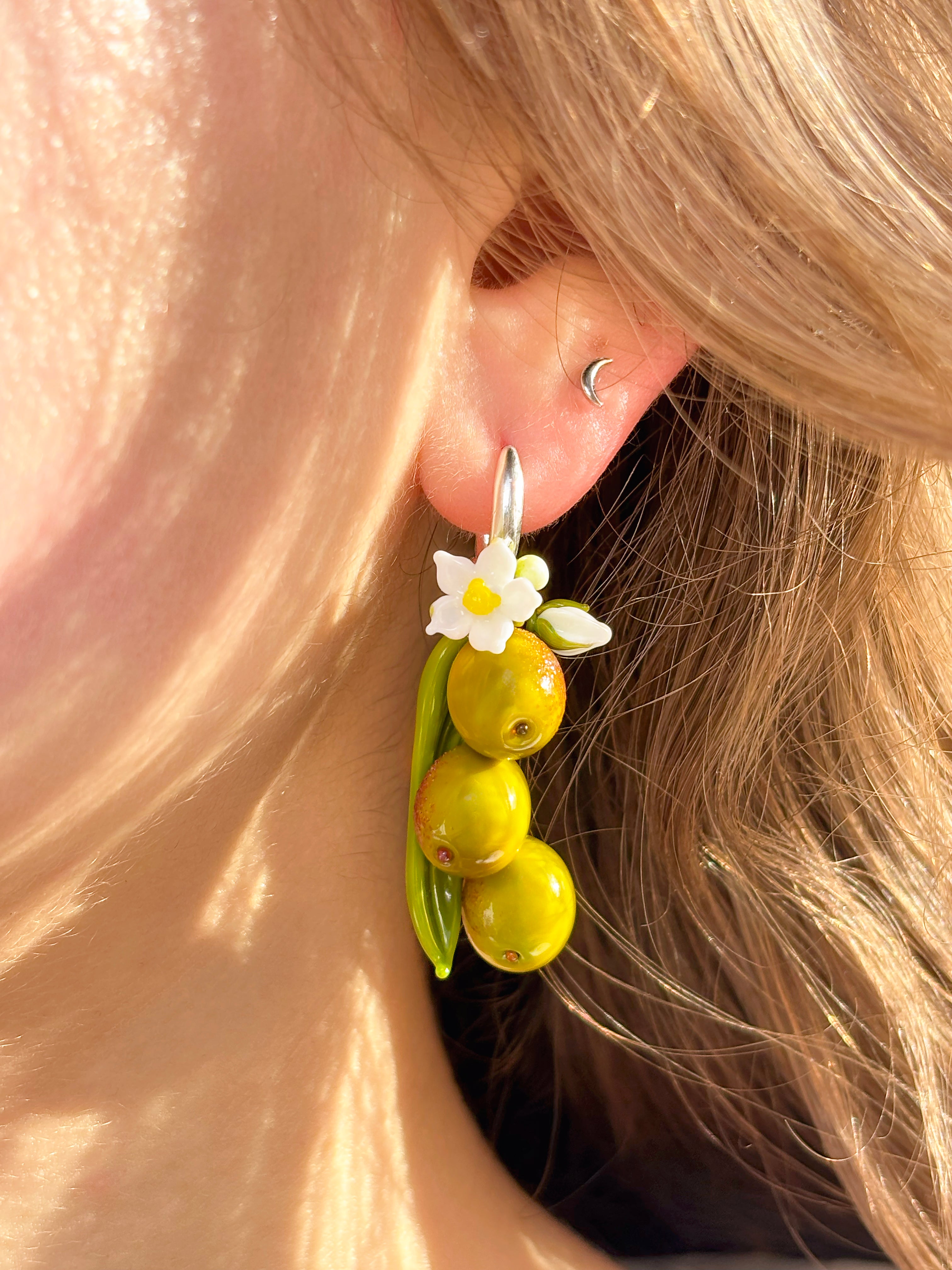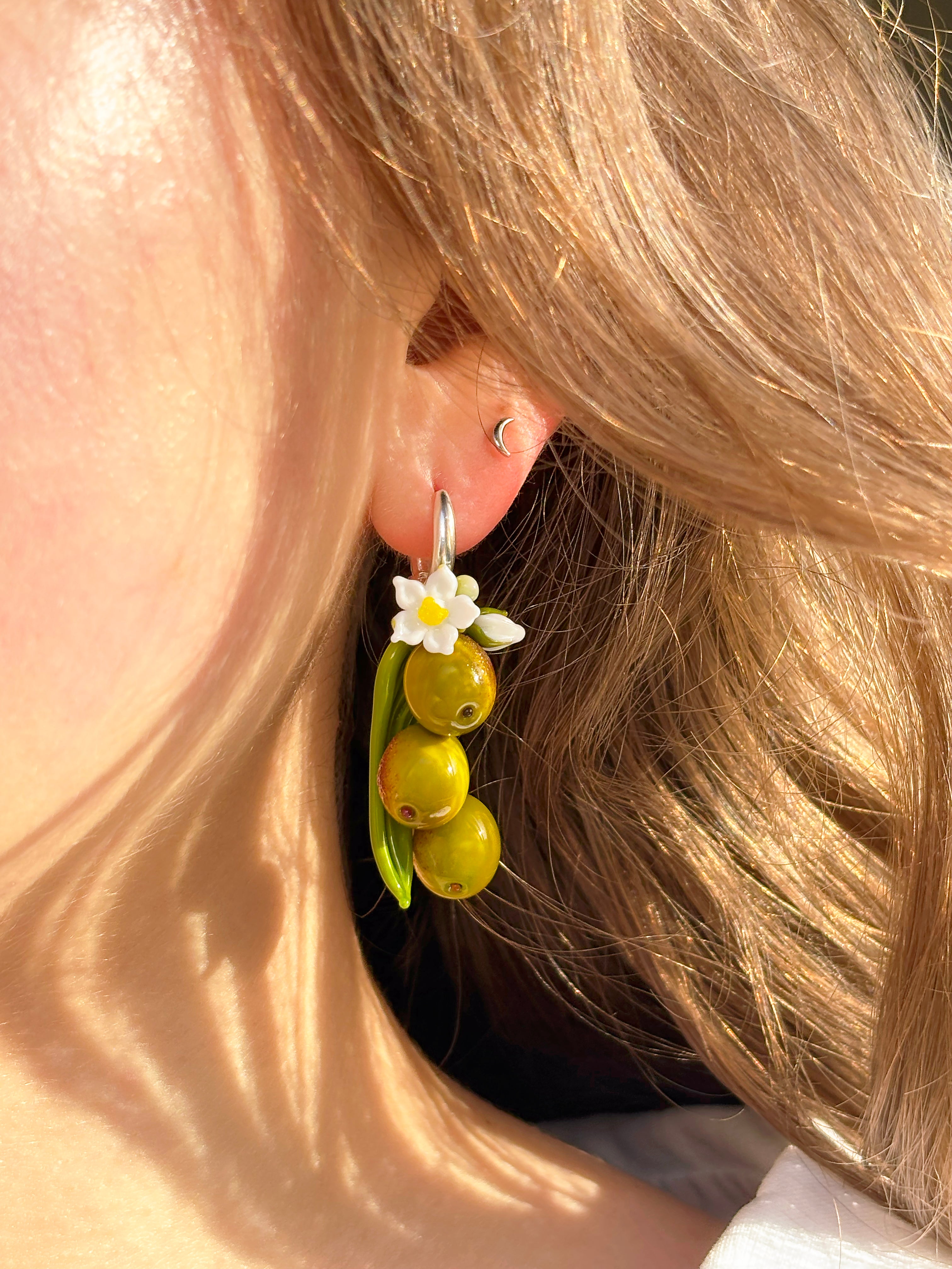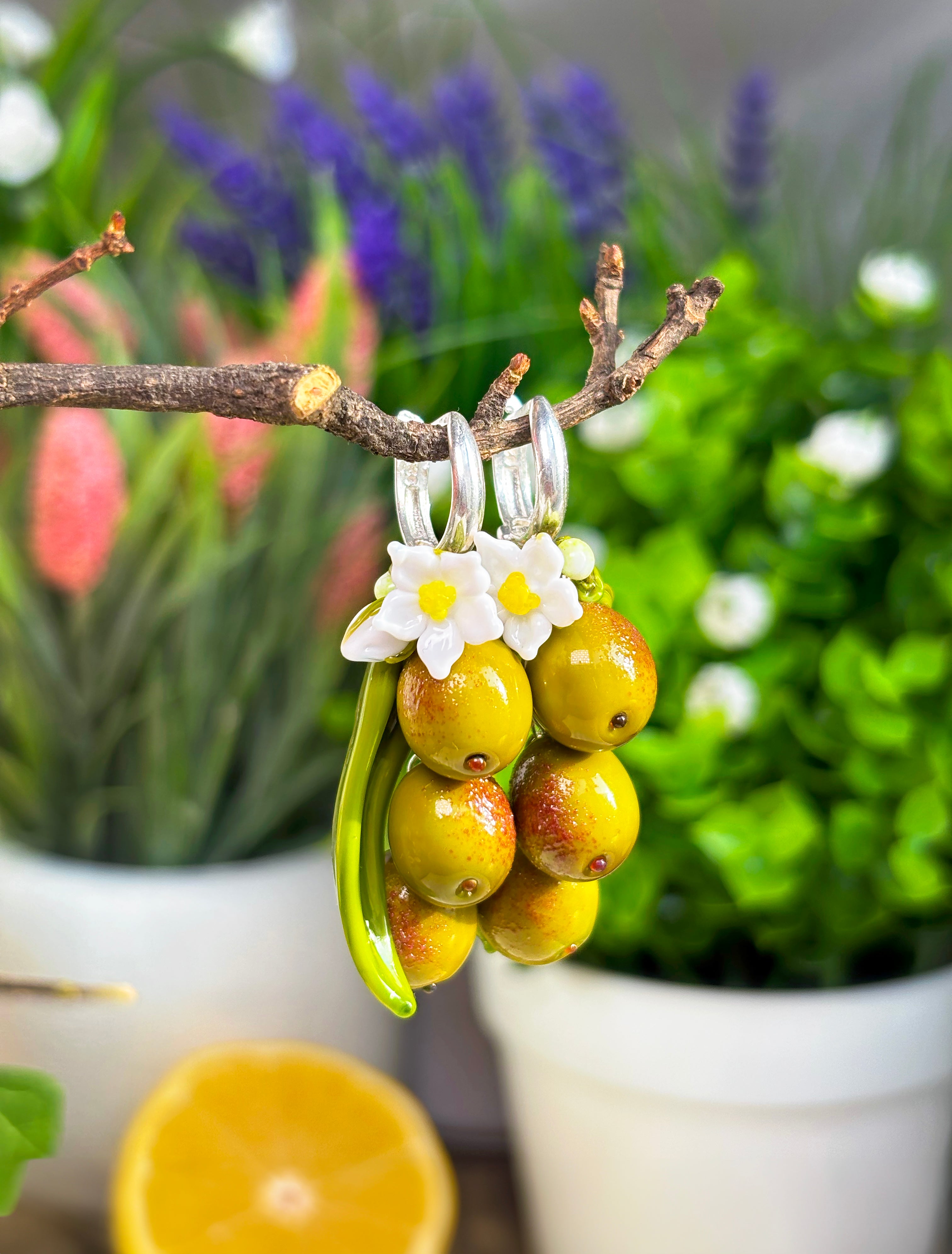 Each olive and blossom in these earrings is flame-sculpted by hand from Murano and Bohemian glass using the centuries-old lampwork technique. Every tiny olive is shaped in a 1000°C flame, then slowly annealed in a kiln to ensure strength and durability.