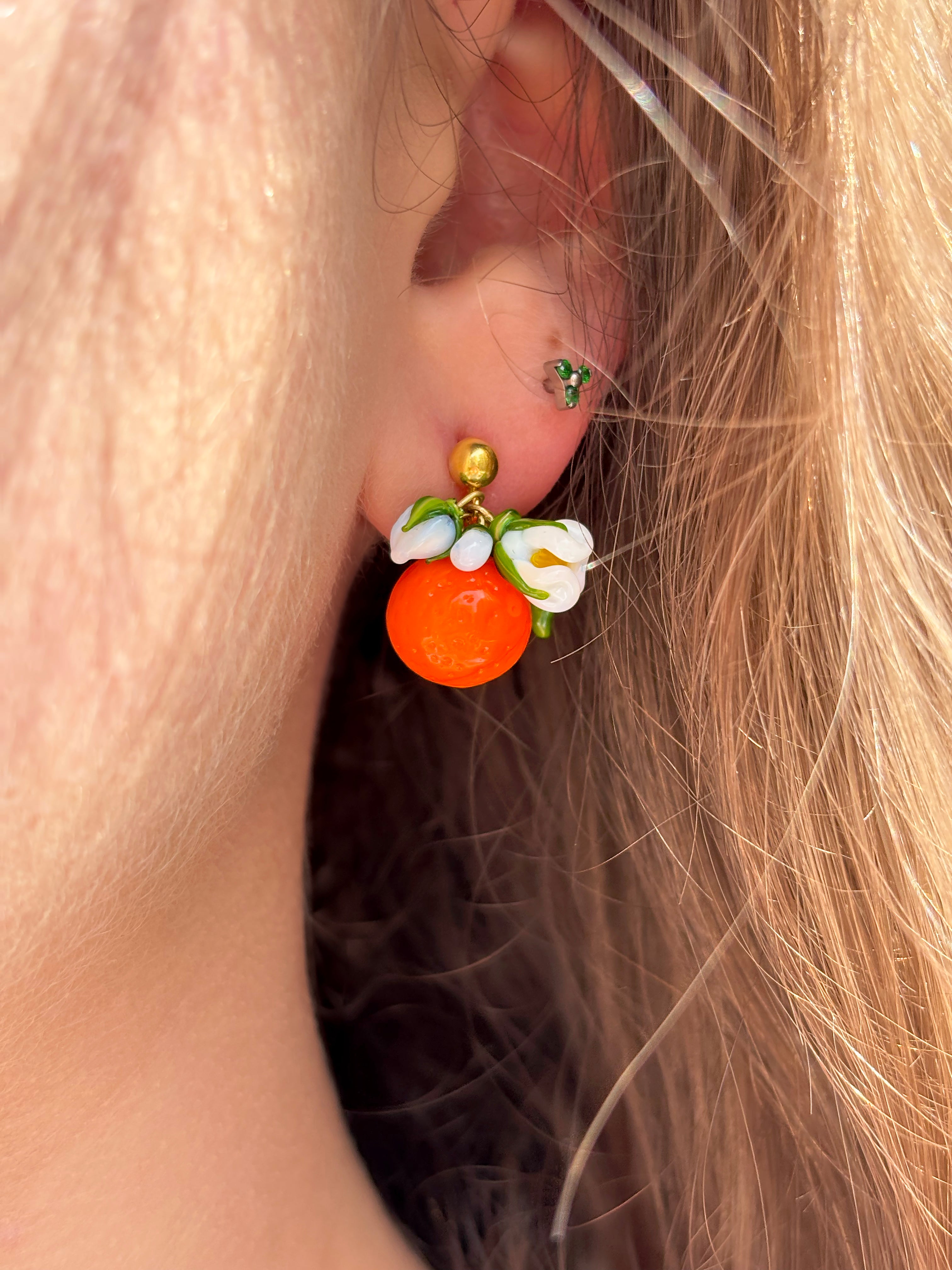 After crafting, the oranges go through an eight-hour annealing process in the kiln to ensure their durability and longevity. Following this heating process, each orange is carefully removed from the mandrel, meticulously cleaned and polished to reveal its sun-kissed luster. The sterling silver findings are then securely attached using a special 24-hour adhesion process, meaning that each pair of earrings requires 3-5 days to complete.