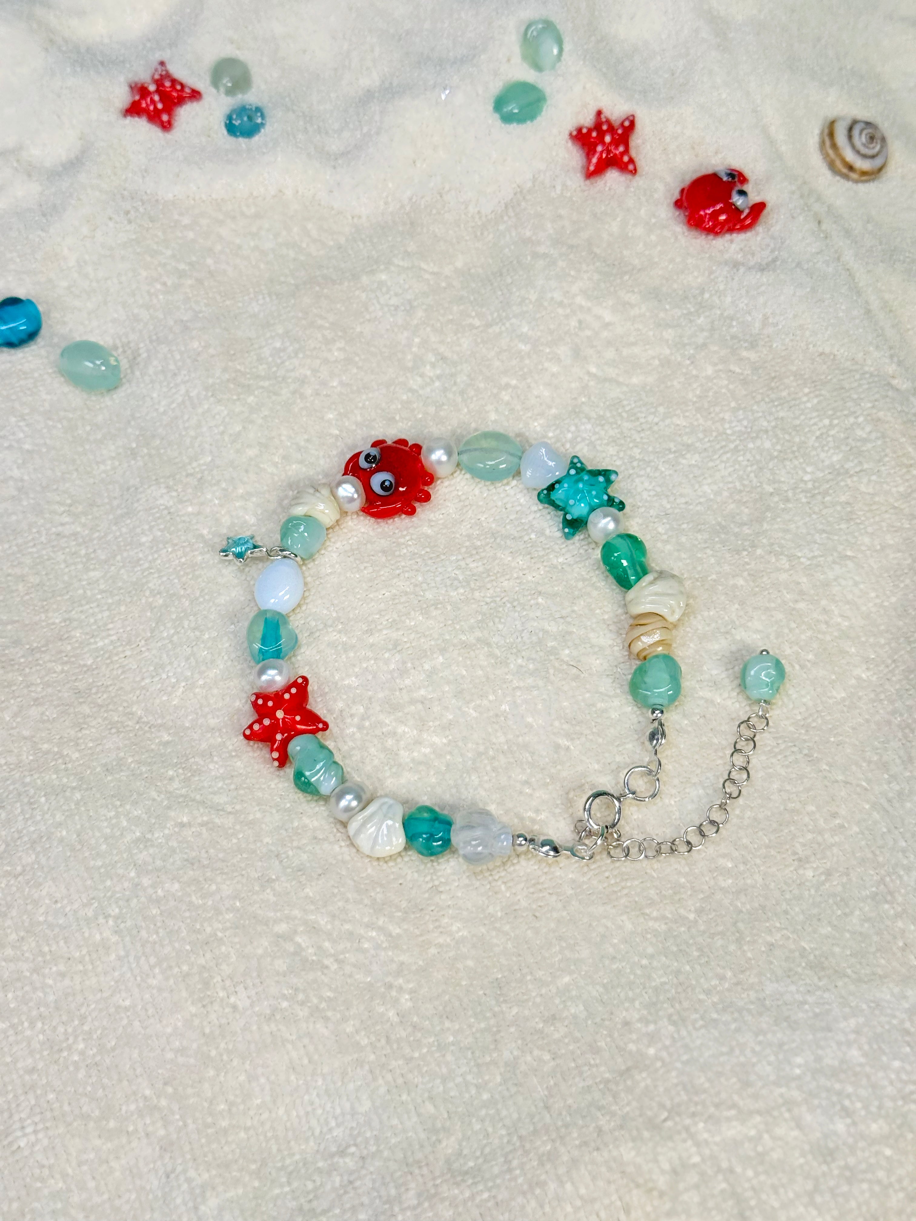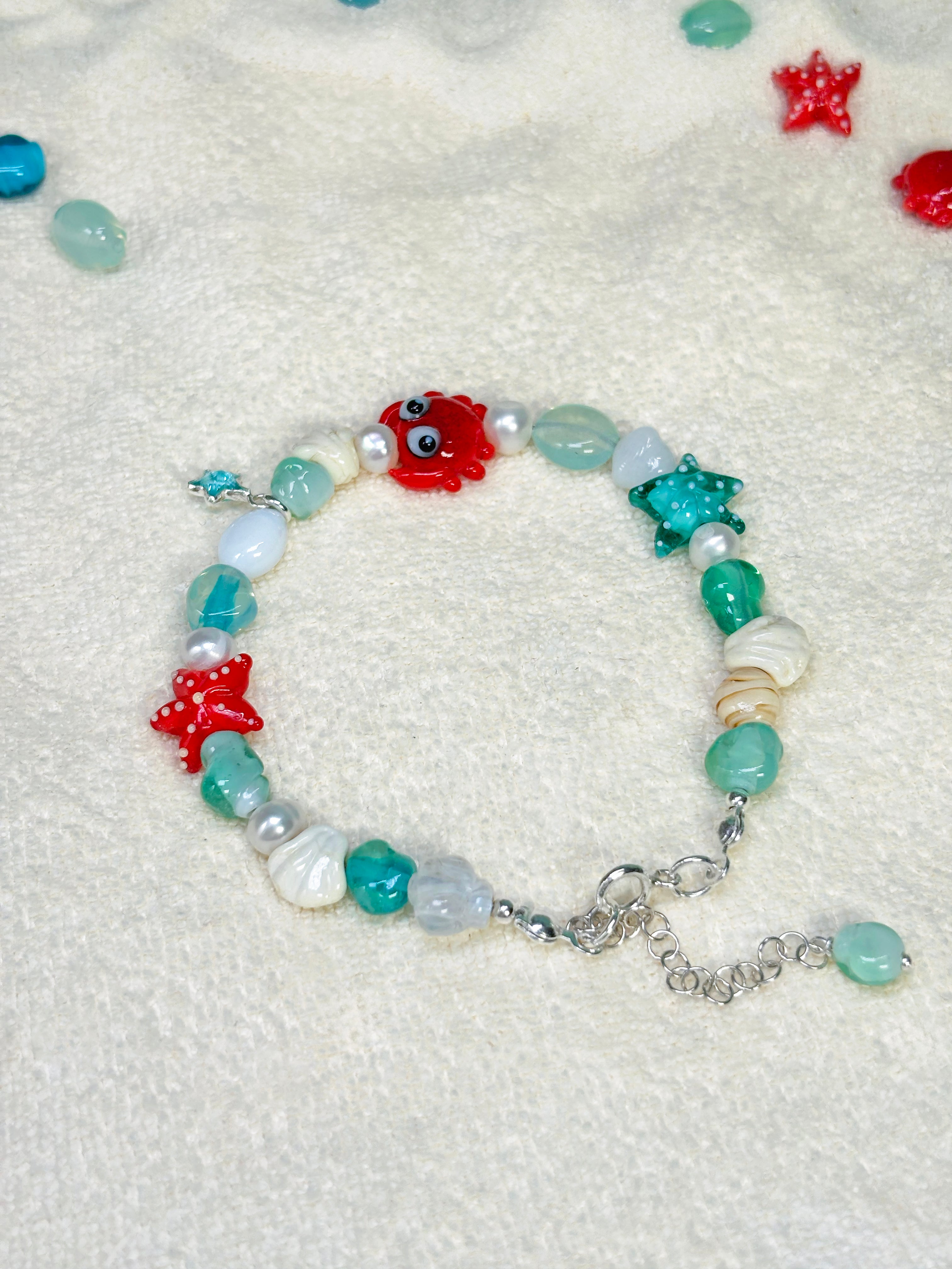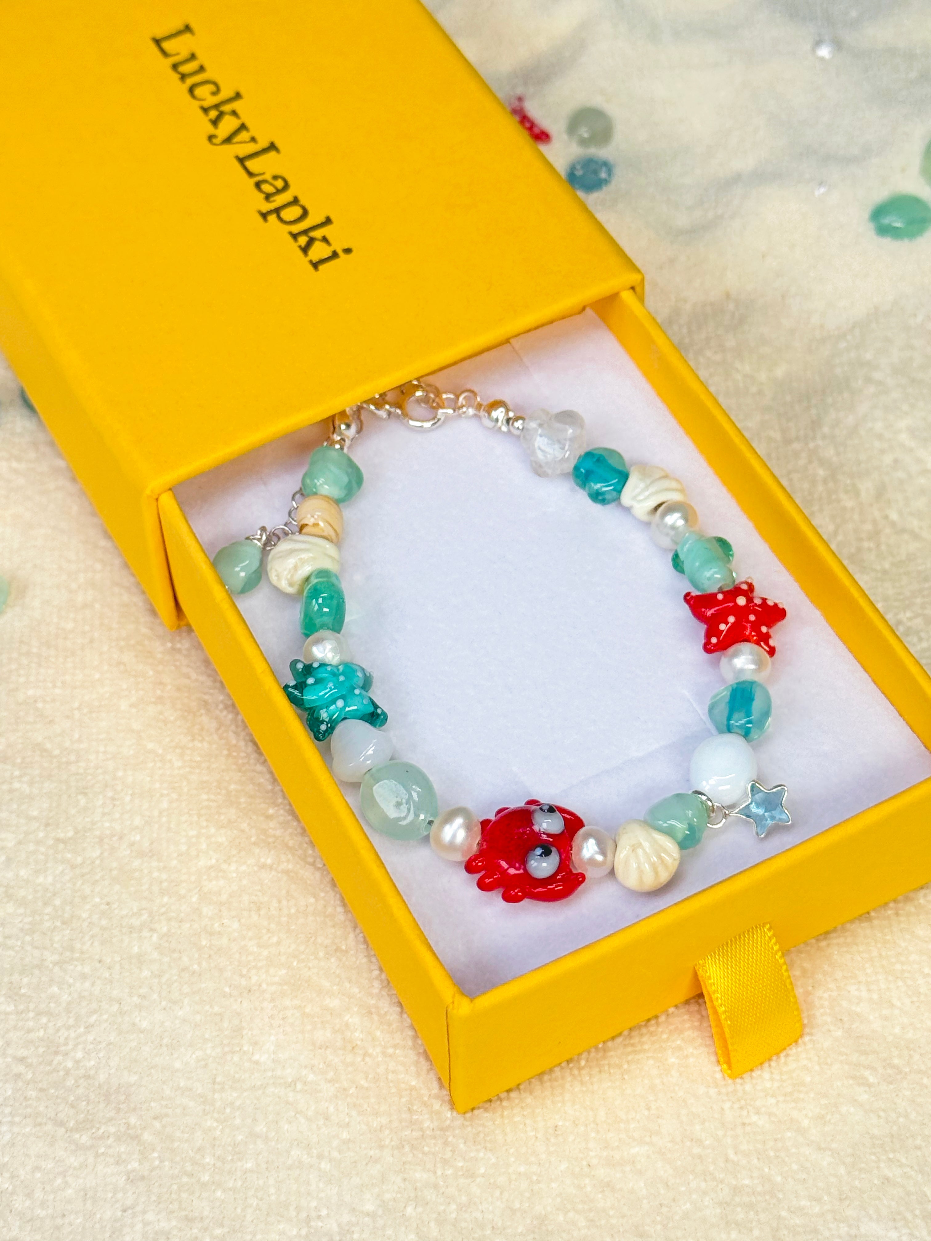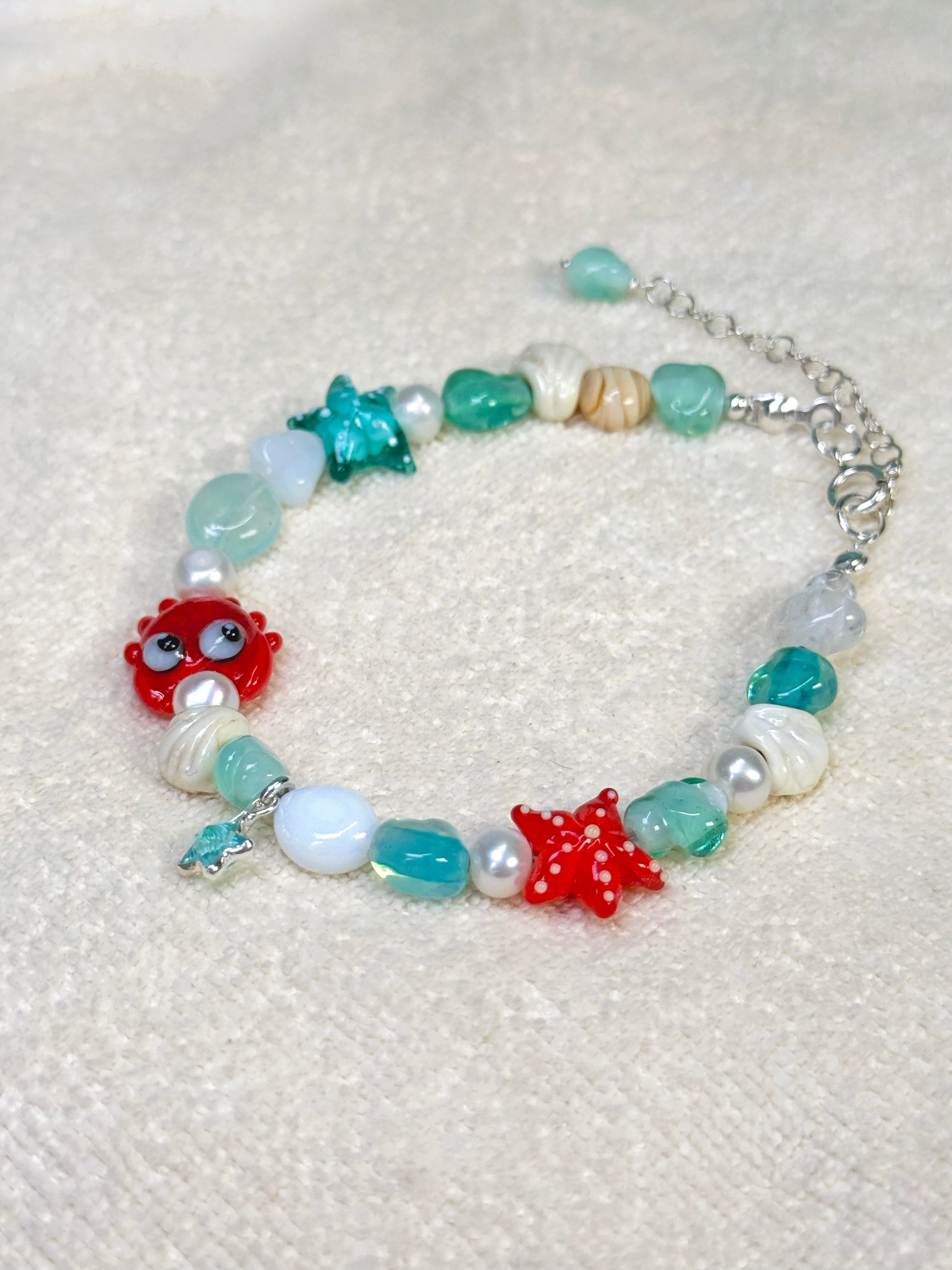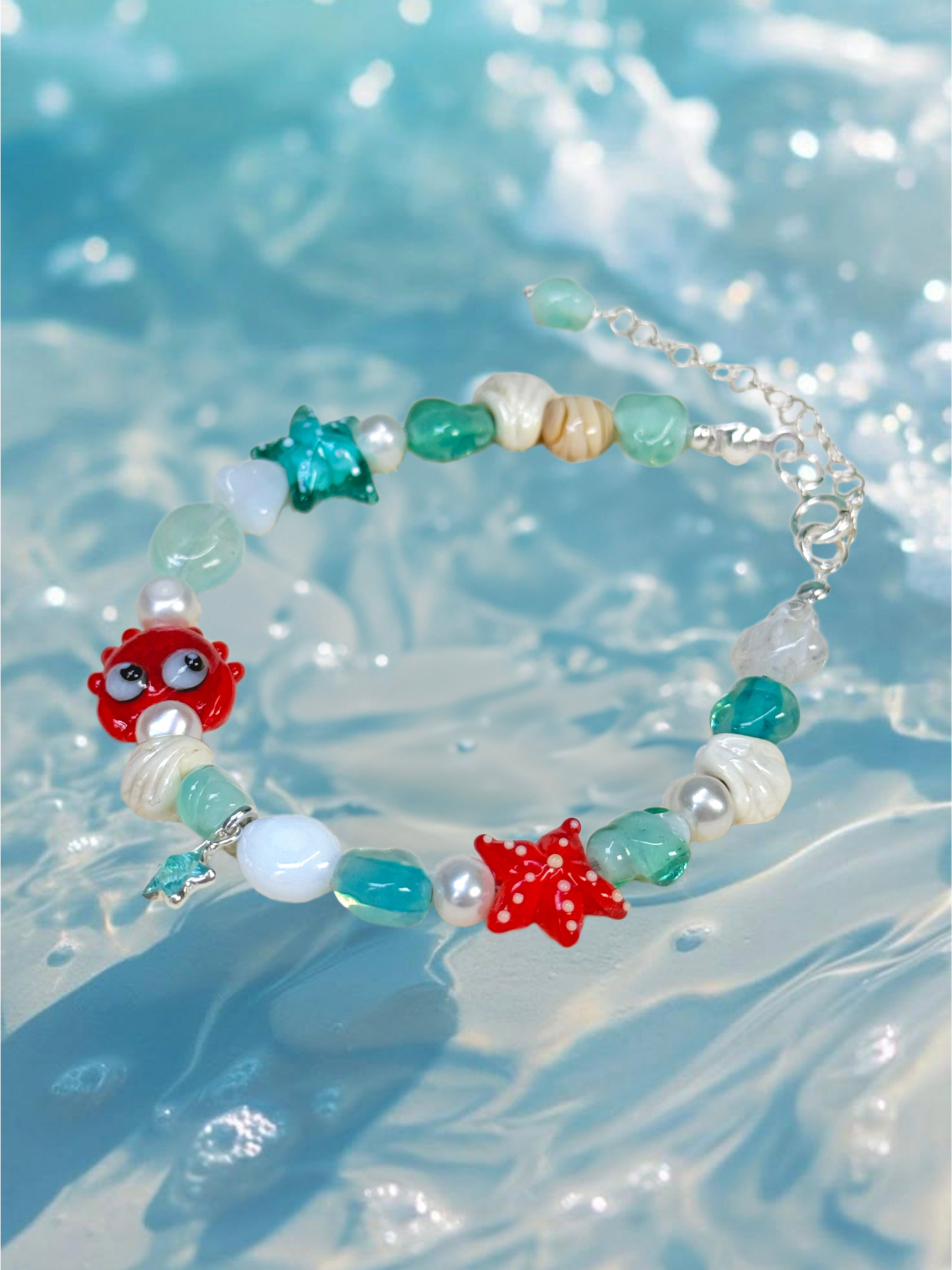 Each tiny crab, sea star, and ocean-inspired bead in this bracelet is flame-sculpted by hand from Murano and Bohemian glass using the traditional lampwork technique. Every detail â from the crabâs little claws to the dotted starfish arms â is shaped in a 1000 °C flame, then annealed in a kiln for lasting strength and beauty.