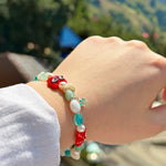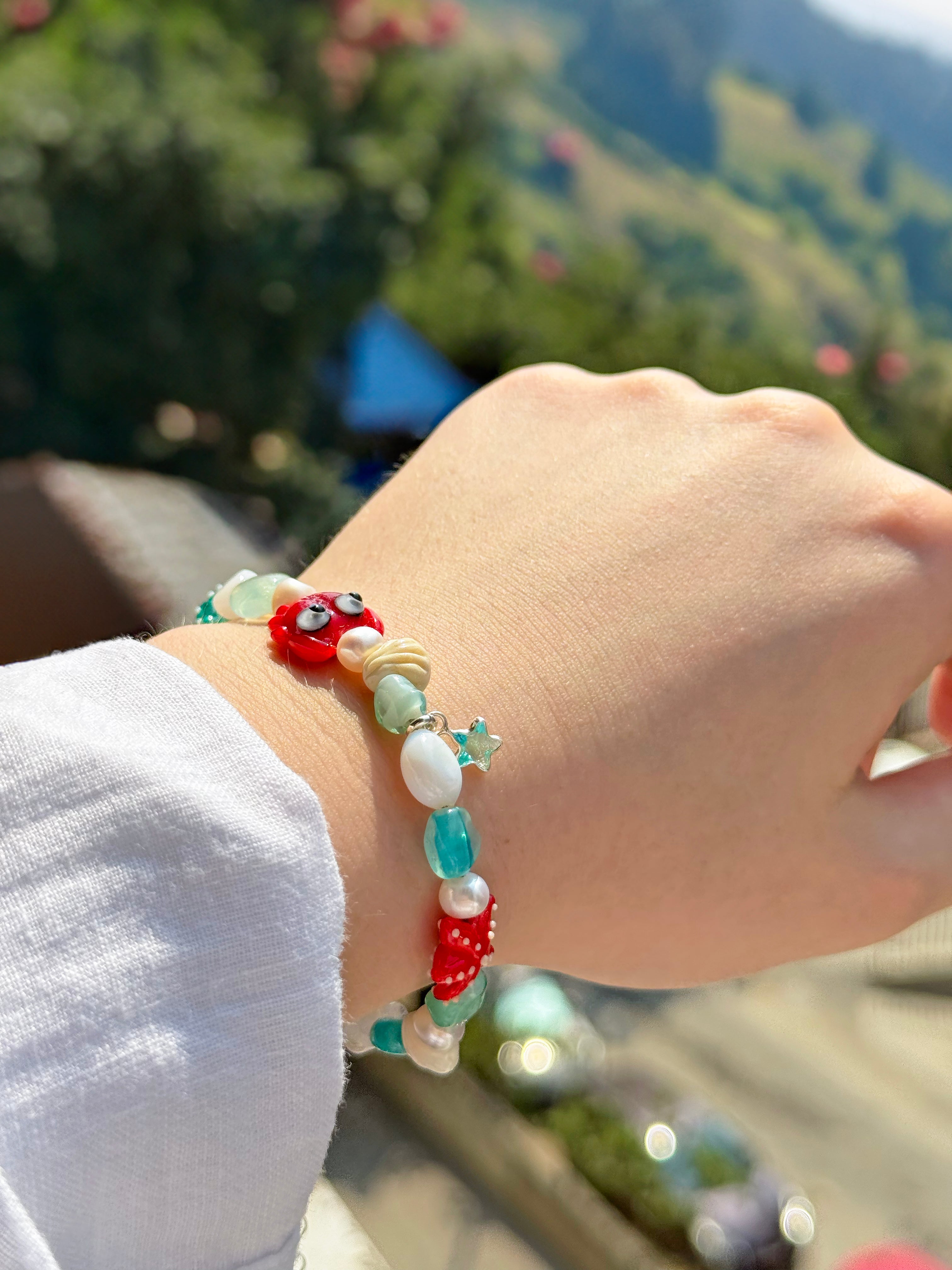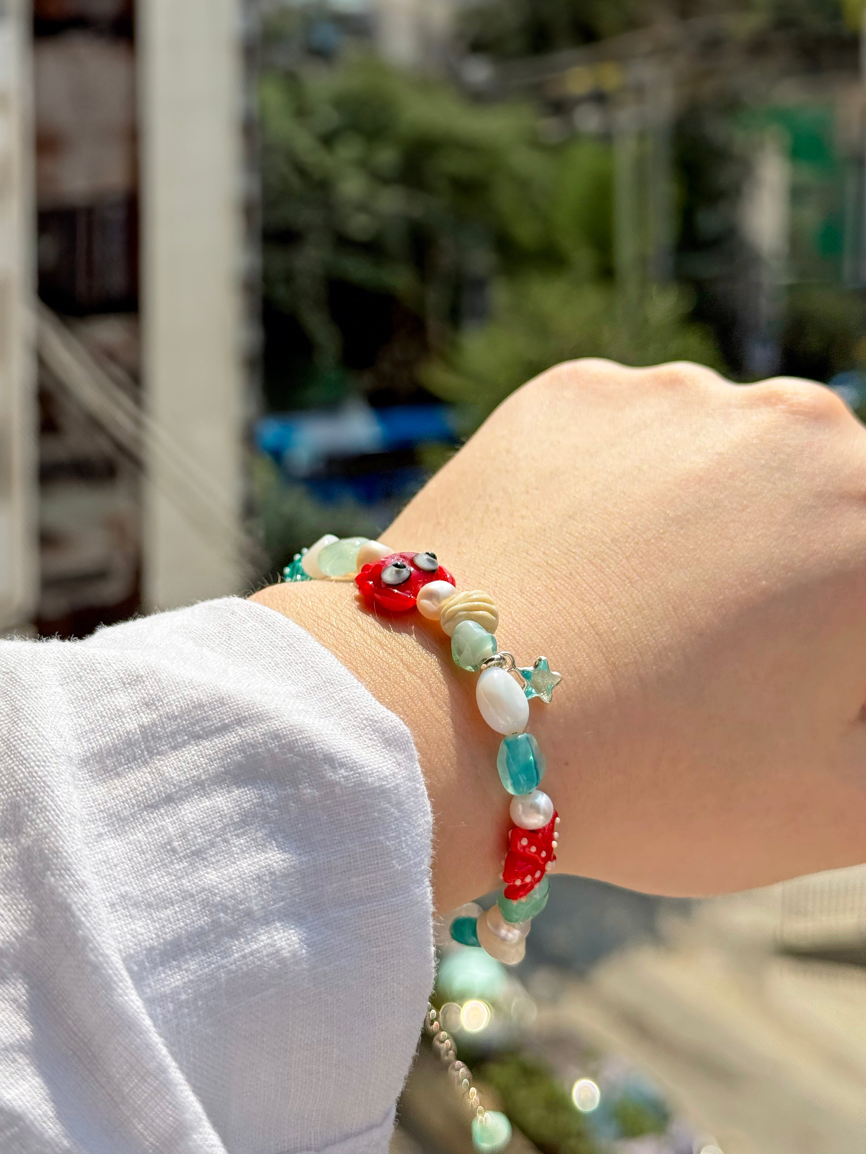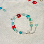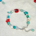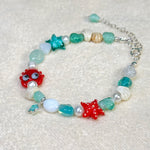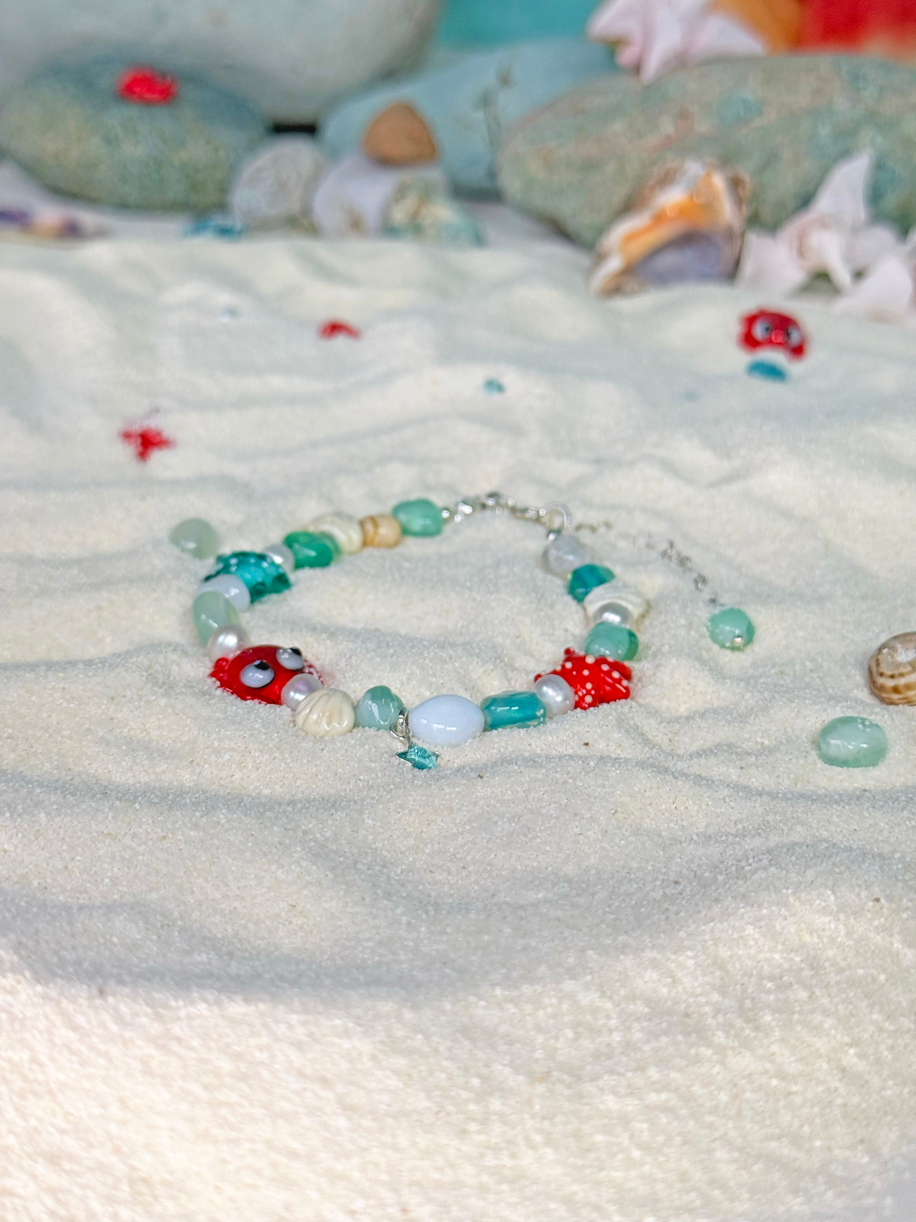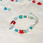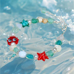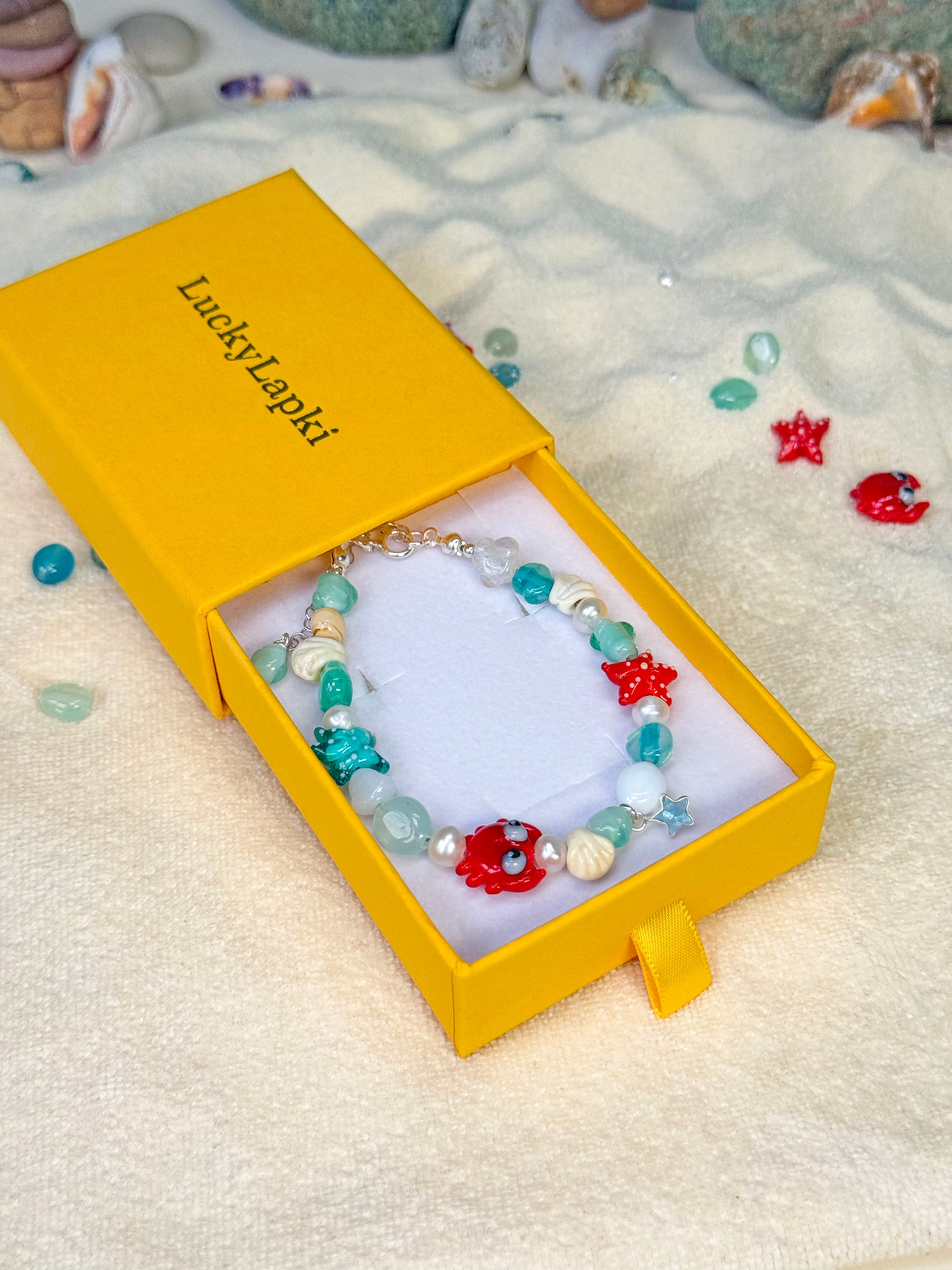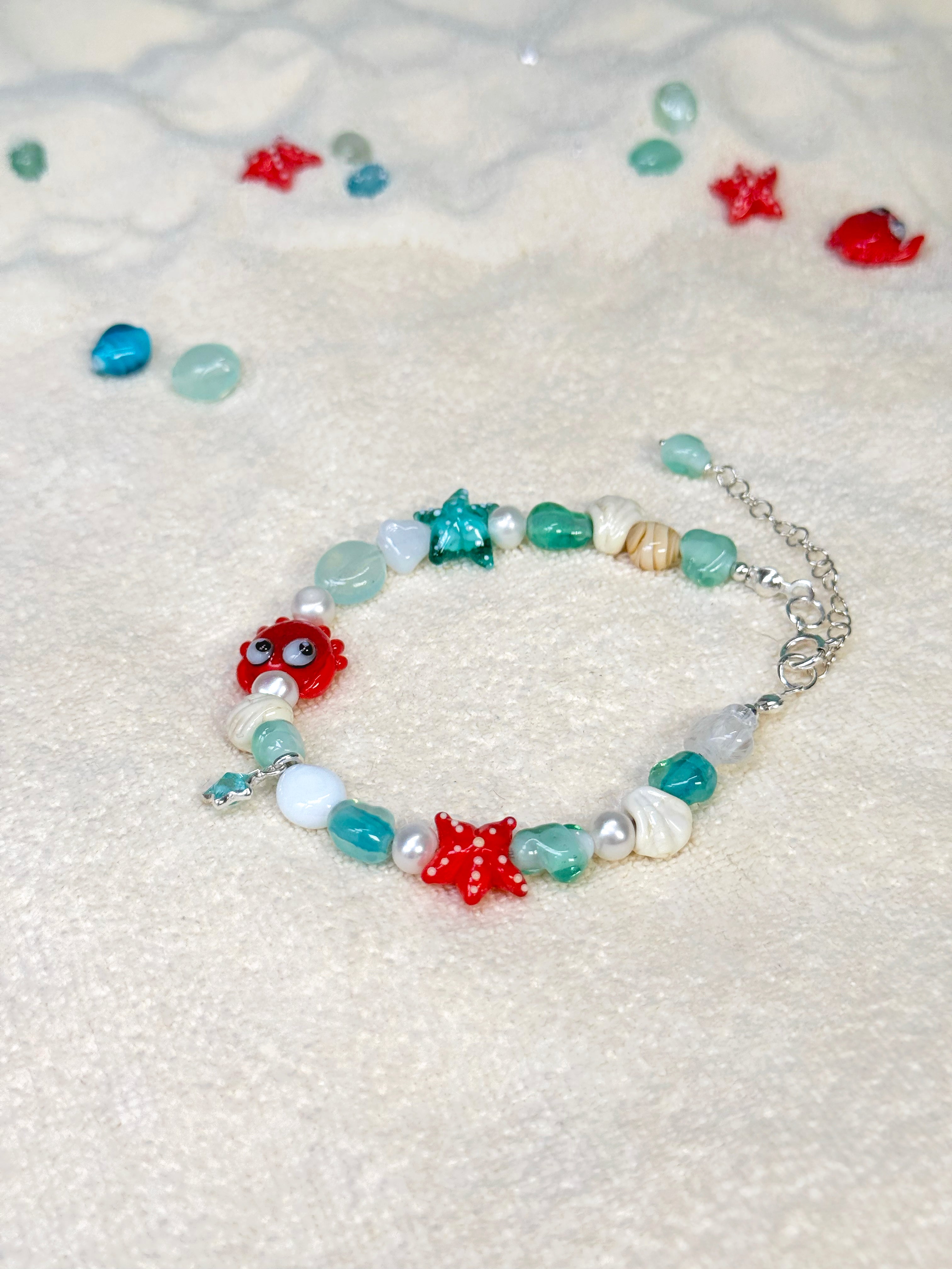 Each tiny crab, sea star, and ocean-inspired bead in this bracelet is flame-sculpted by hand from Murano and Bohemian glass using the traditional lampwork technique. Every detail â from the crabâs little claws to the dotted starfish arms â is shaped in a 1000 °C flame, then annealed in a kiln for lasting strength and beauty.