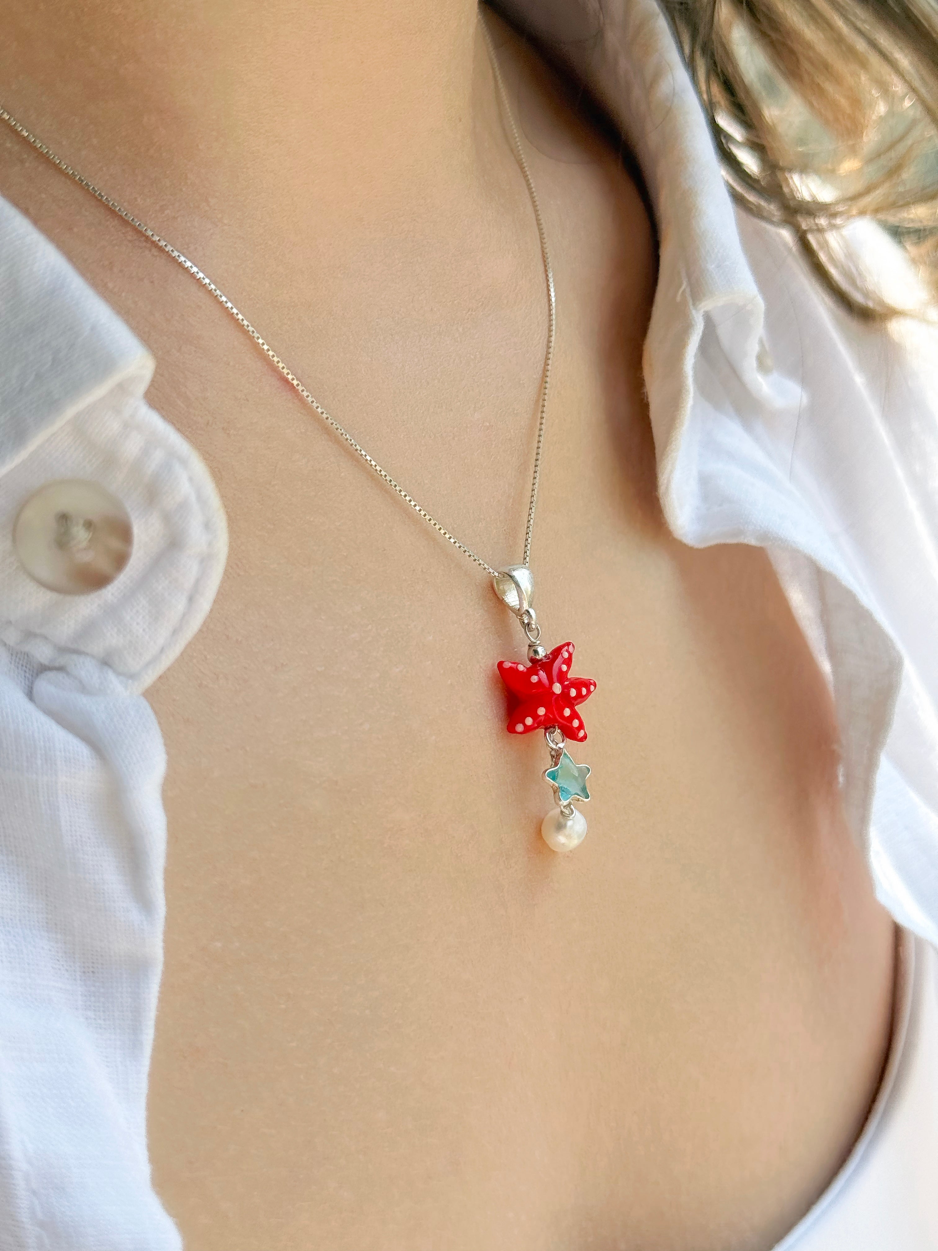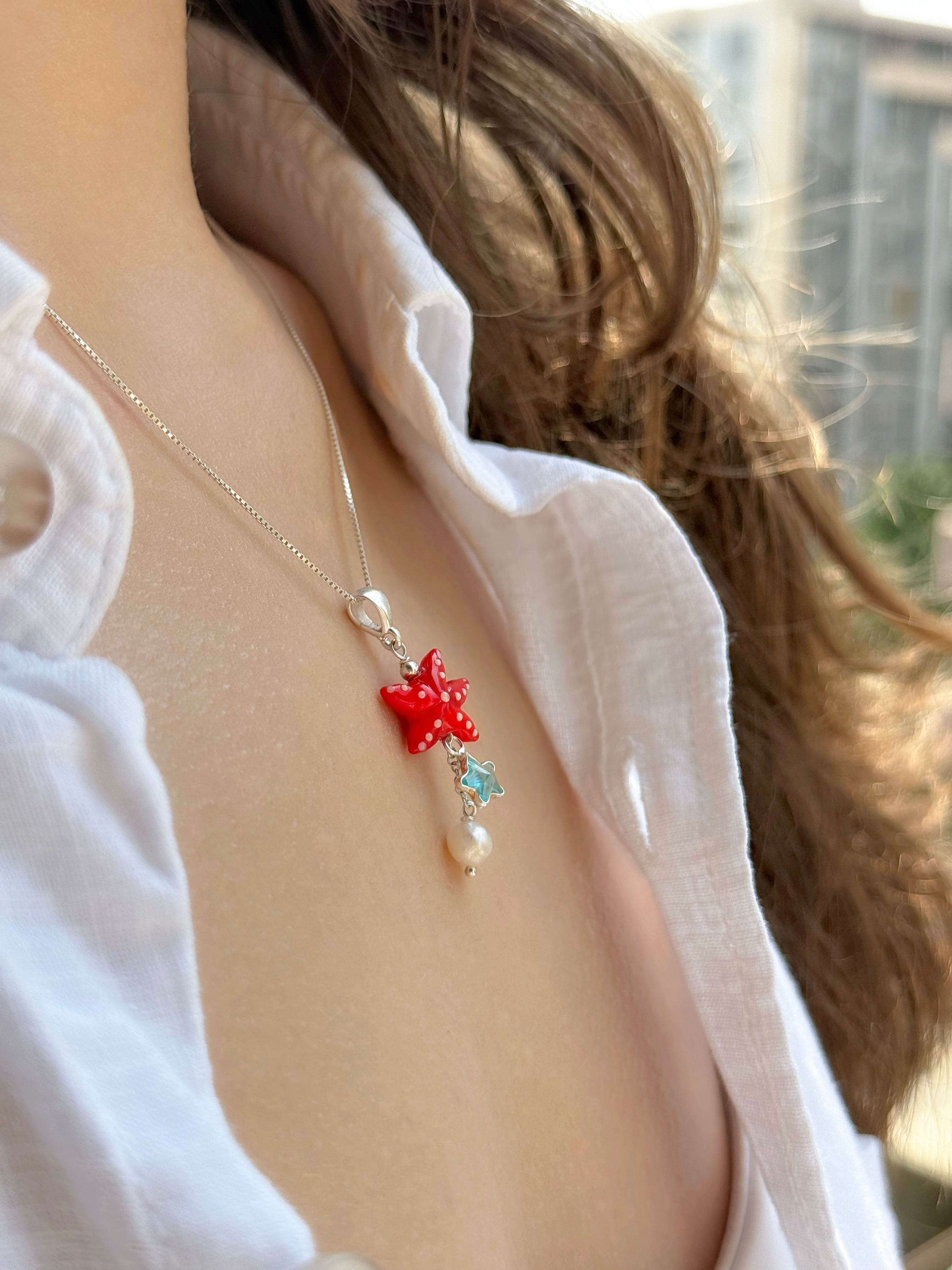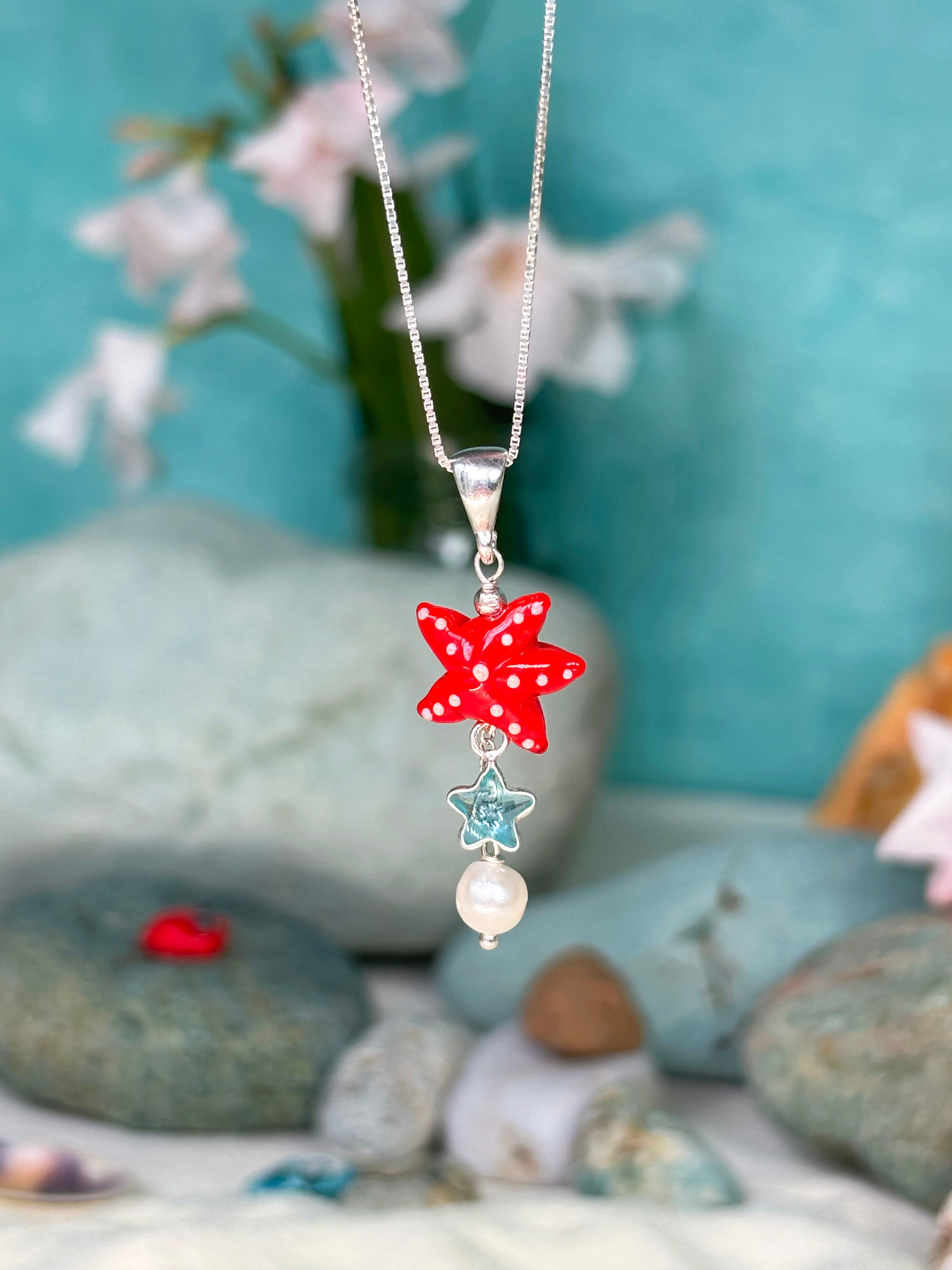 Each vibrant red sea star in this pendant is flame-sculpted by hand from Murano and Bohemian glass using the centuries-old lampwork technique. Every tiny star bead is shaped in a 1 000 °C flame for 30–45 minutes, then annealed in a kiln for 8 hours to ensure strength and durability.