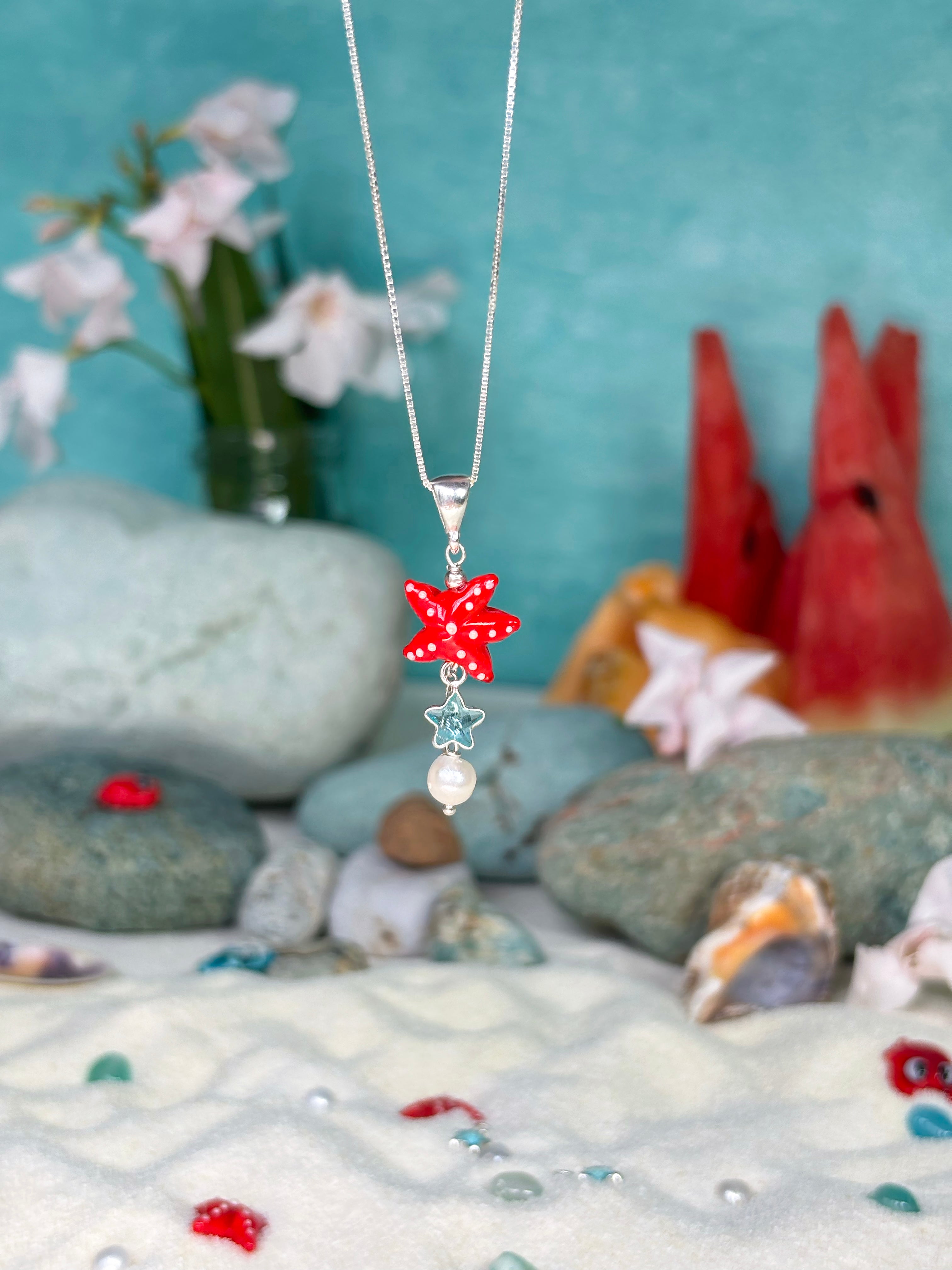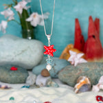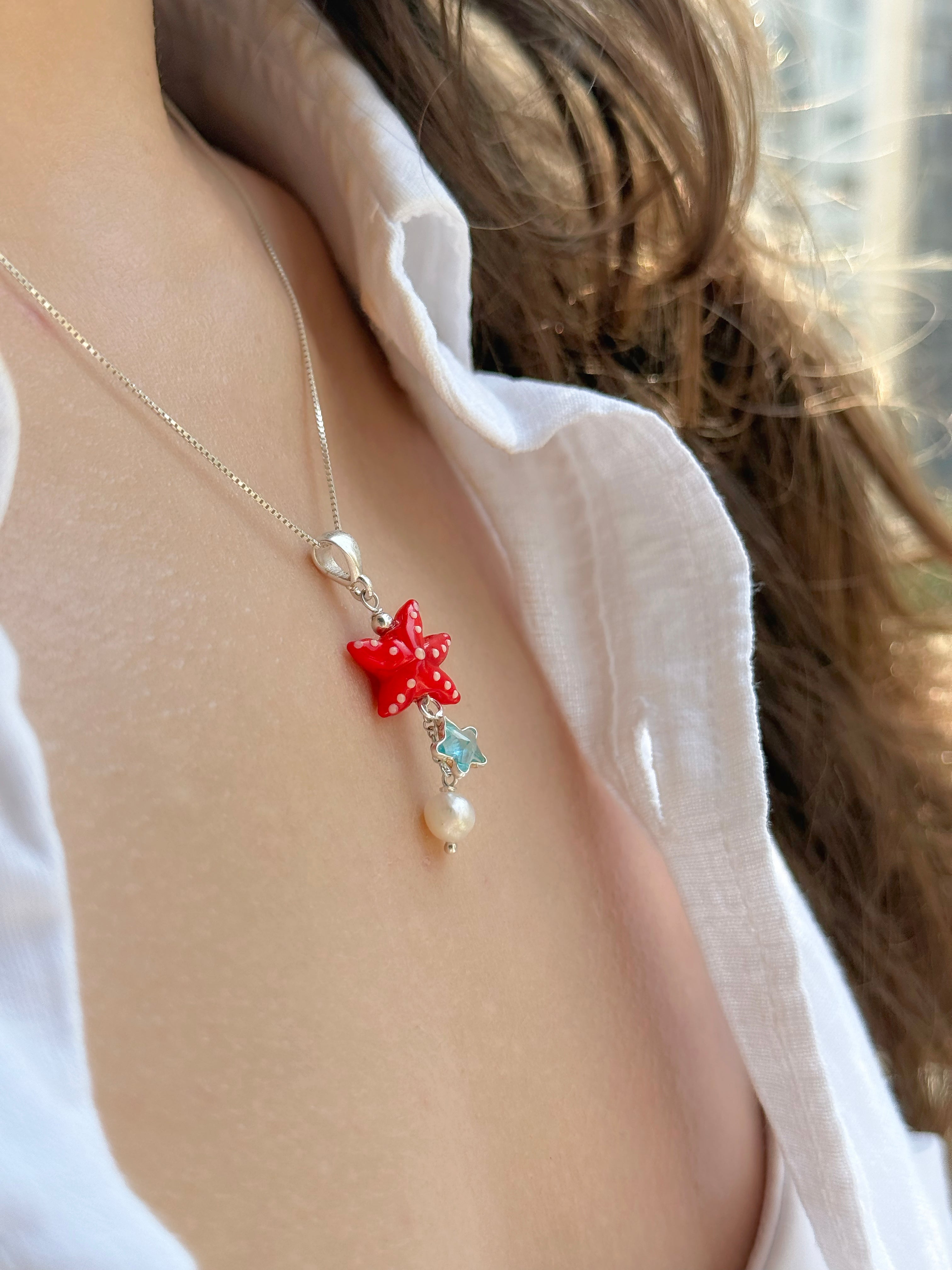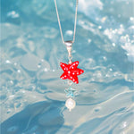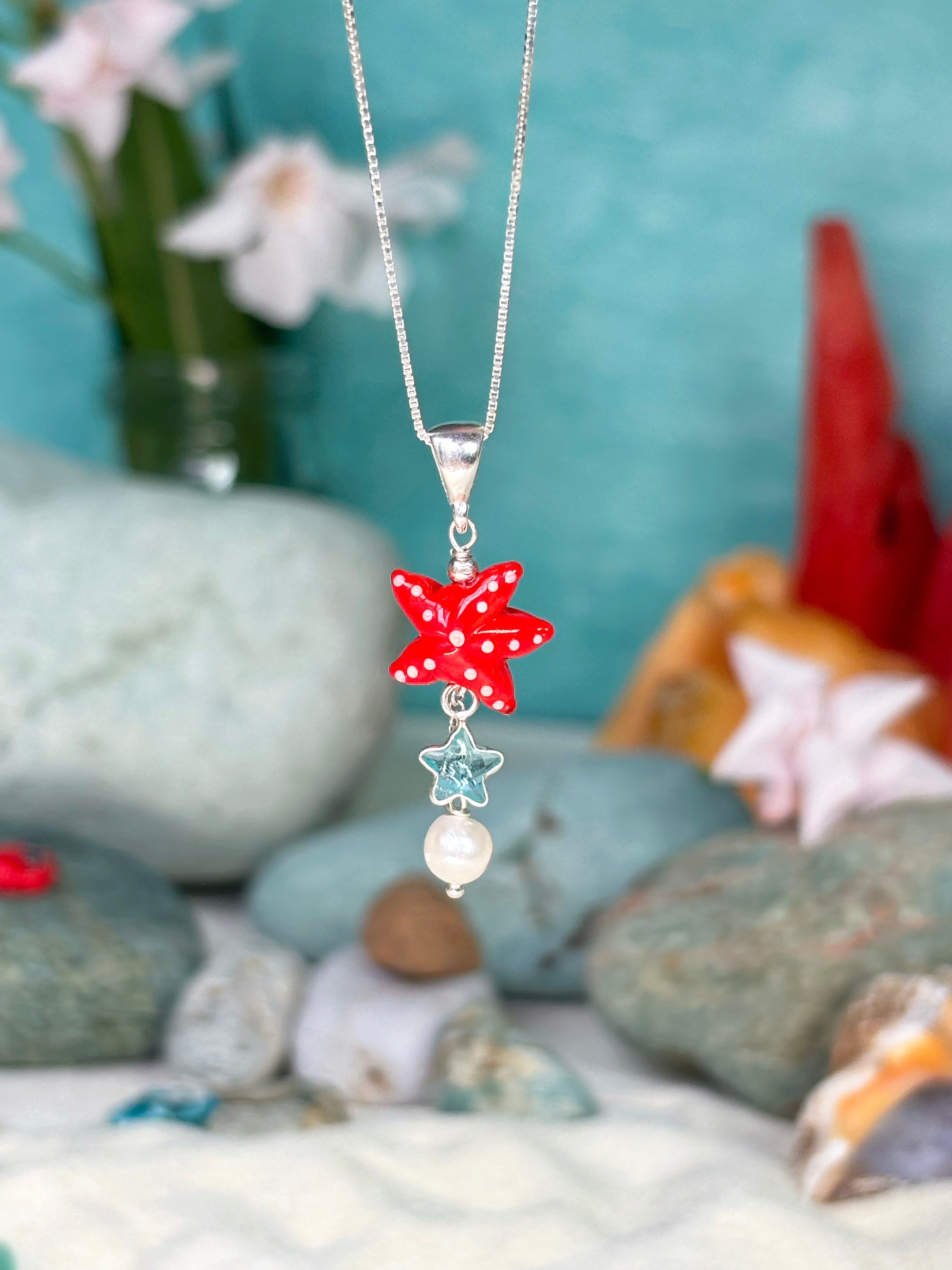 Each vibrant red sea star in this pendant is flame-sculpted by hand from Murano and Bohemian glass using the centuries-old lampwork technique. Every tiny star bead is shaped in a 1 000 °C flame for 30–45 minutes, then annealed in a kiln for 8 hours to ensure strength and durability.