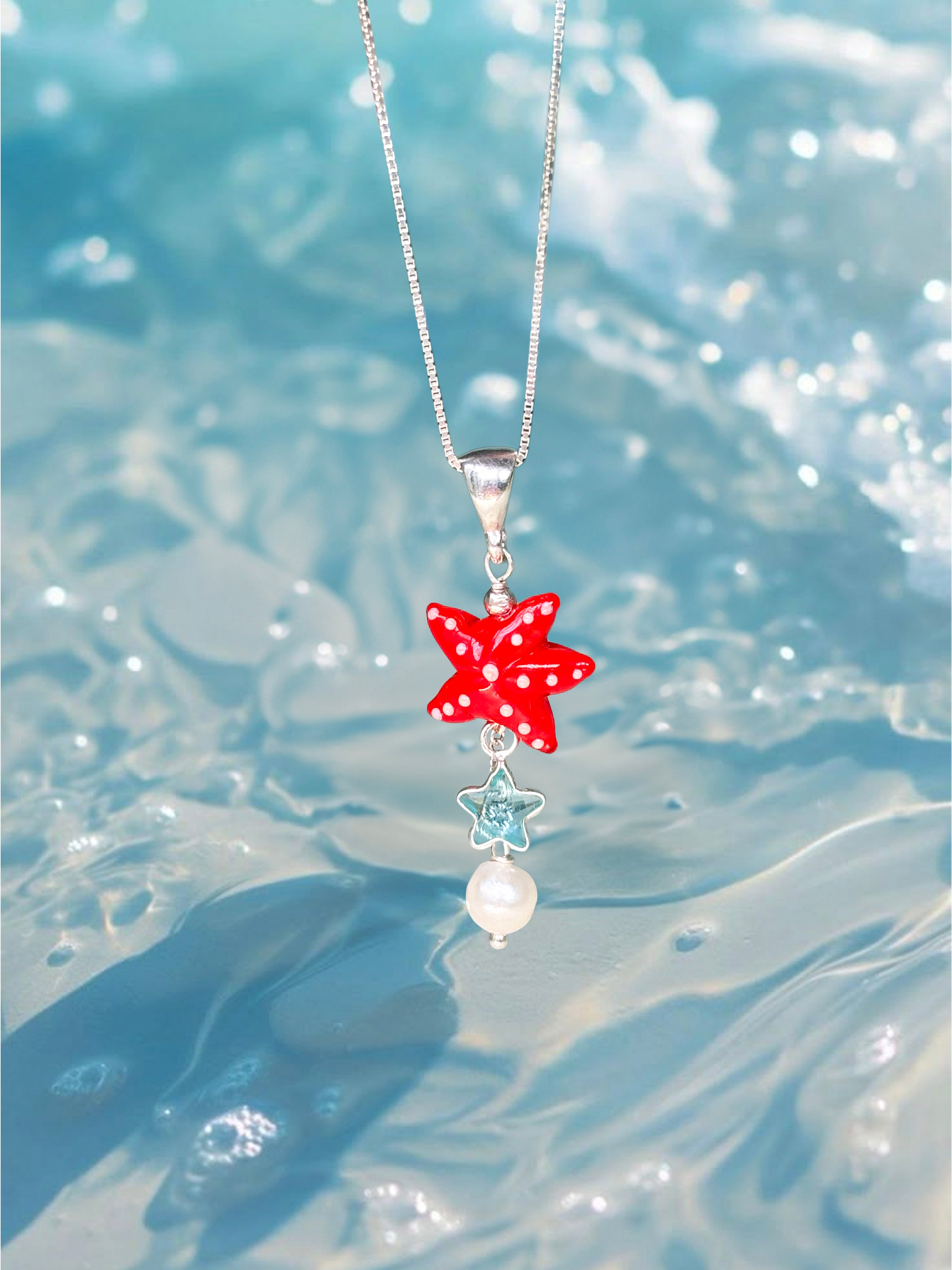 Below the sea star hangs a tiny aqua star set with a sparkling cubic zirconia ✨ and a delicate freshwater pearl, adding a soft ocean shimmer to the design.