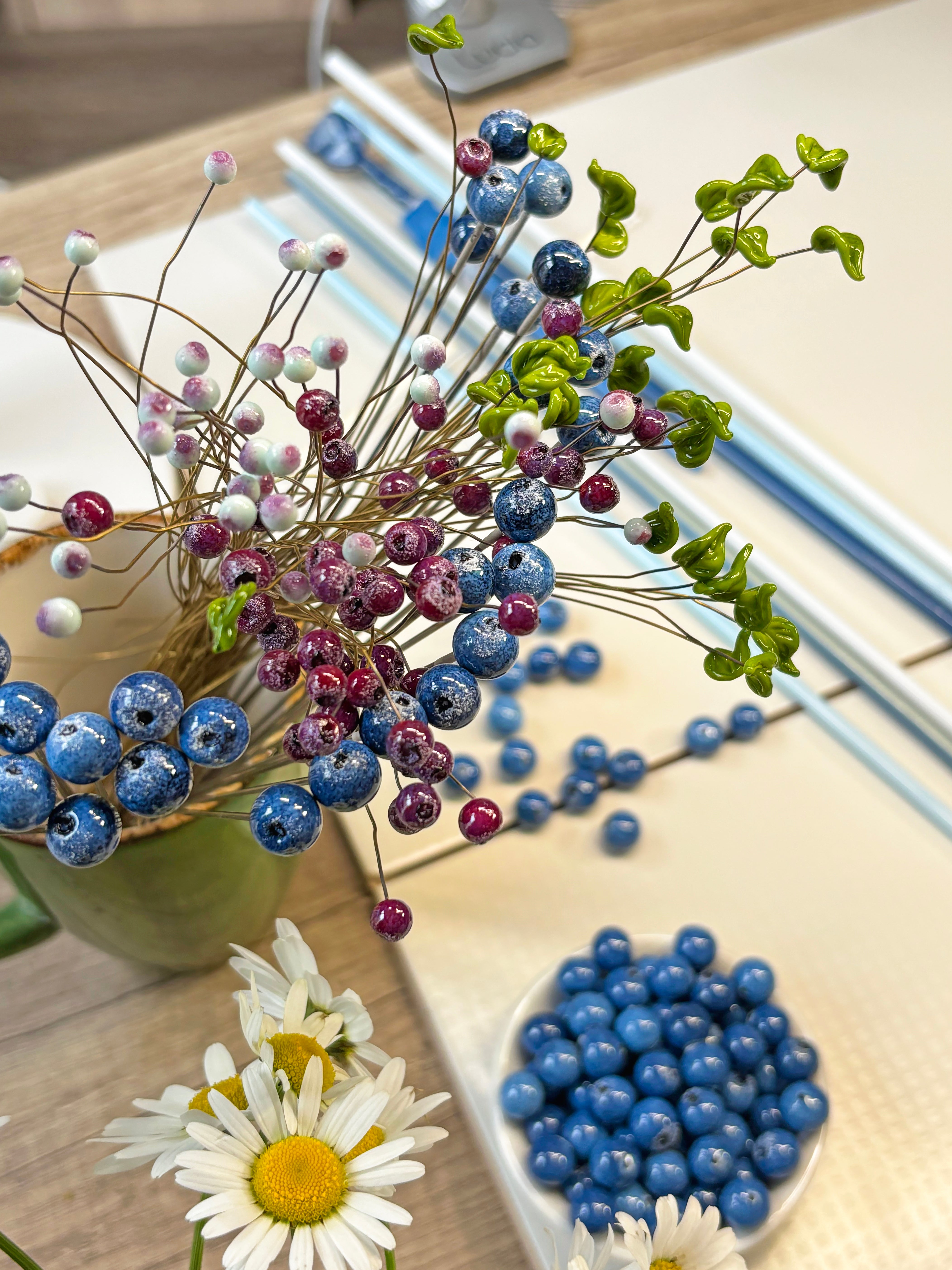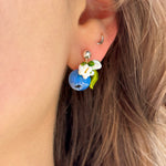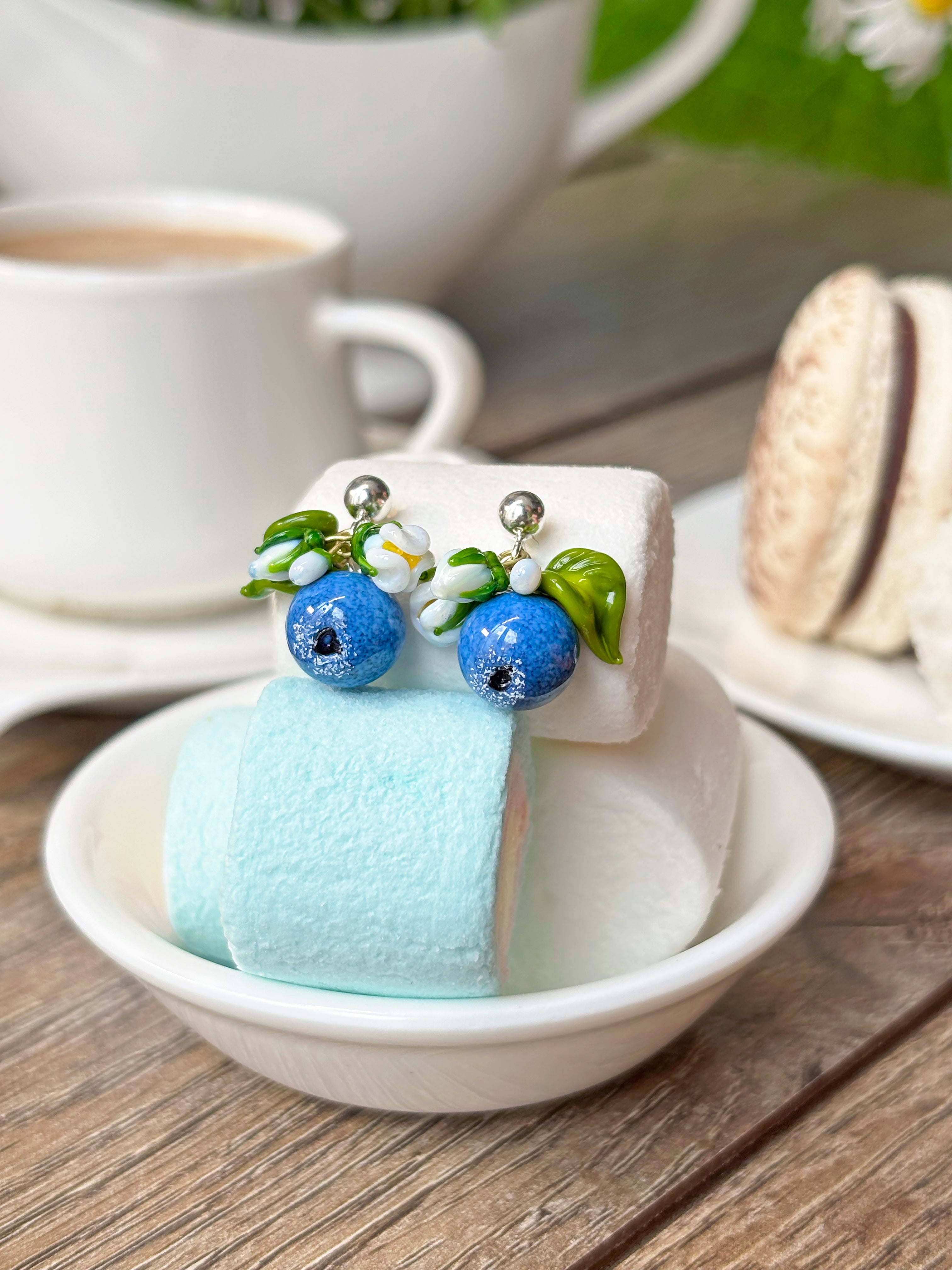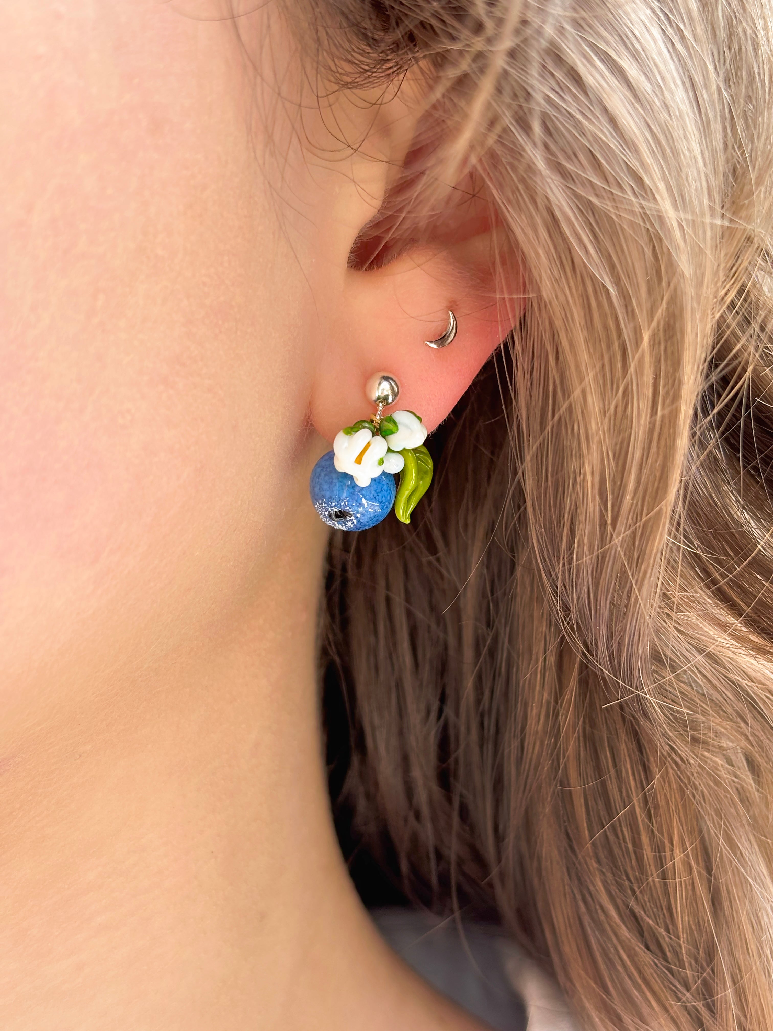 Each blueberry and flower in this pair of stud earrings is individually flame-sculpted from Murano and Bohemian glass using the traditional lampwork technique. Every tiny detail — from the petals to the leaves — is shaped by hand in a 1000°C flame, then slowly annealed in a kiln to ensure strength and longevity.