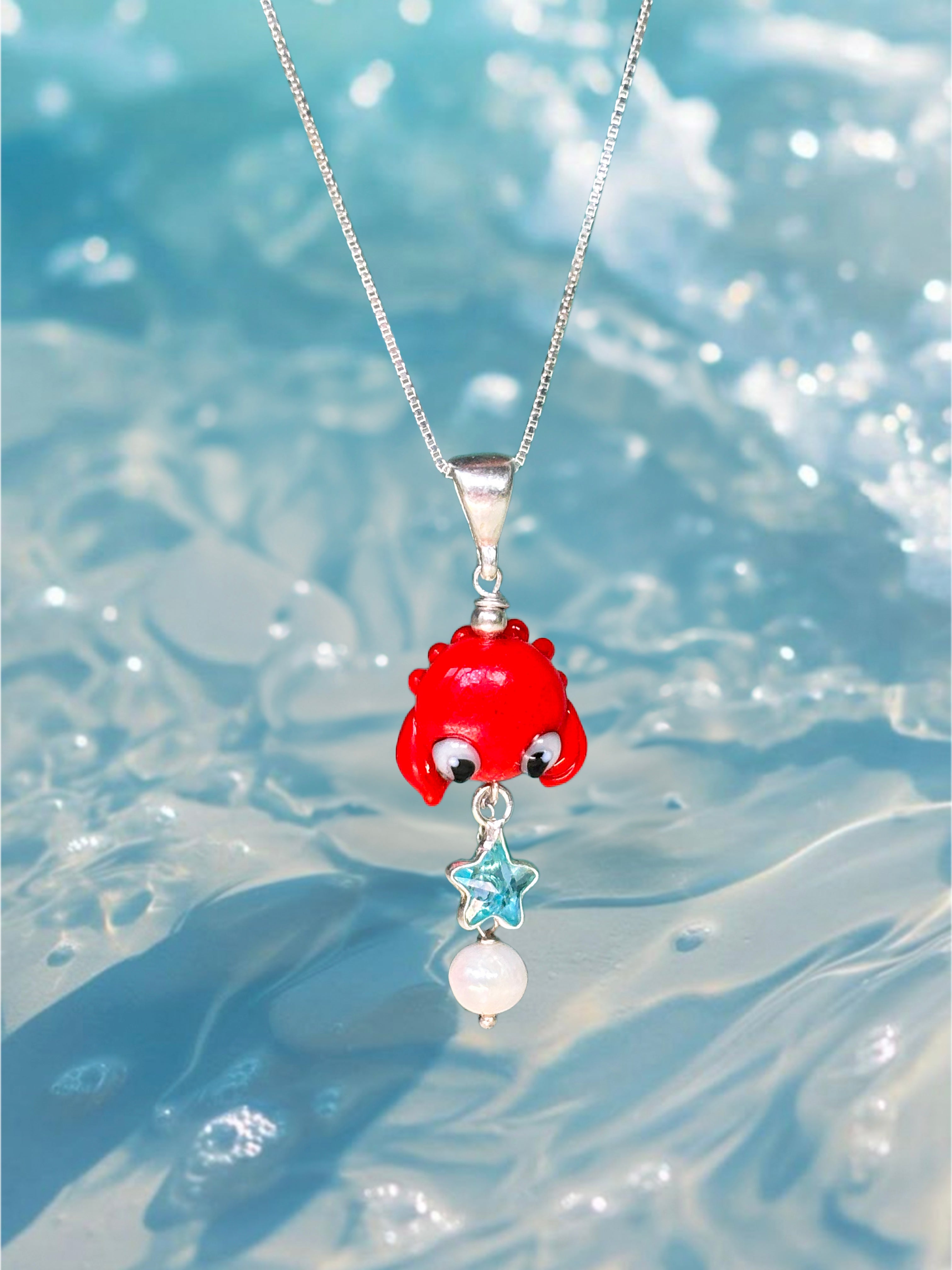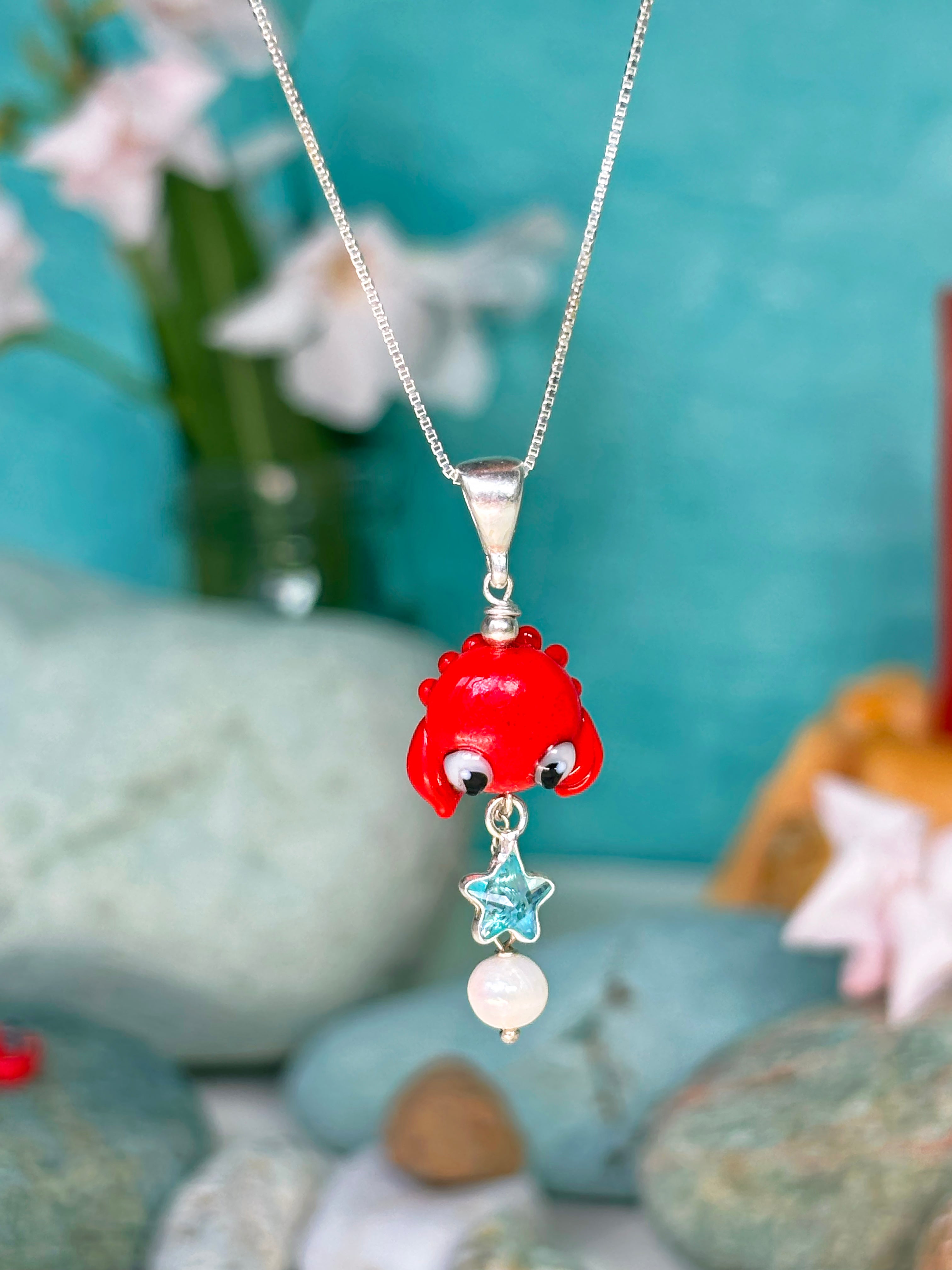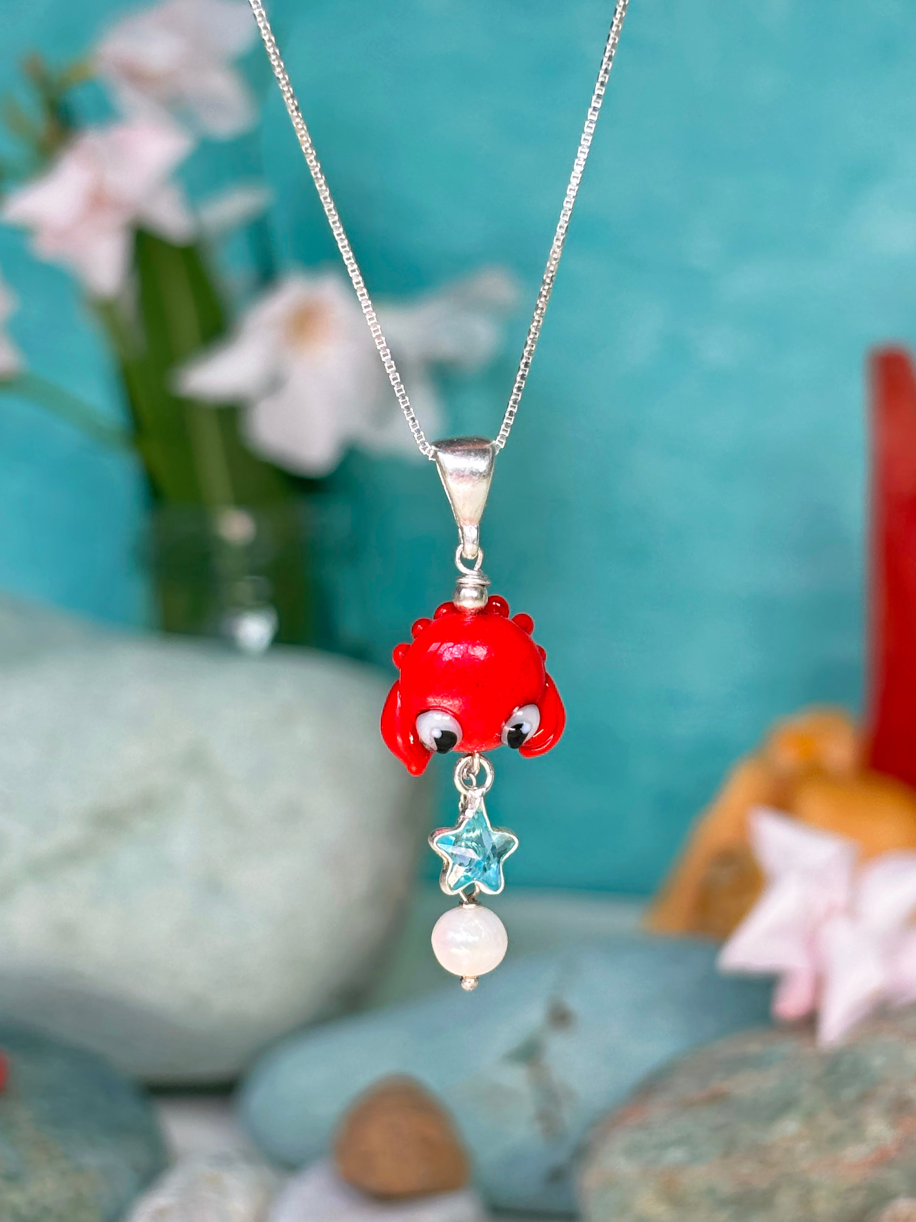 Each adorable little crab in this pendant is flame-sculpted by hand from Murano and Bohemian glass using the centuries-old lampwork technique. Every bead is shaped in a 1 000 °C flame for 30–45 minutes, then annealed in a kiln for 8 hours to ensure strength and durability.