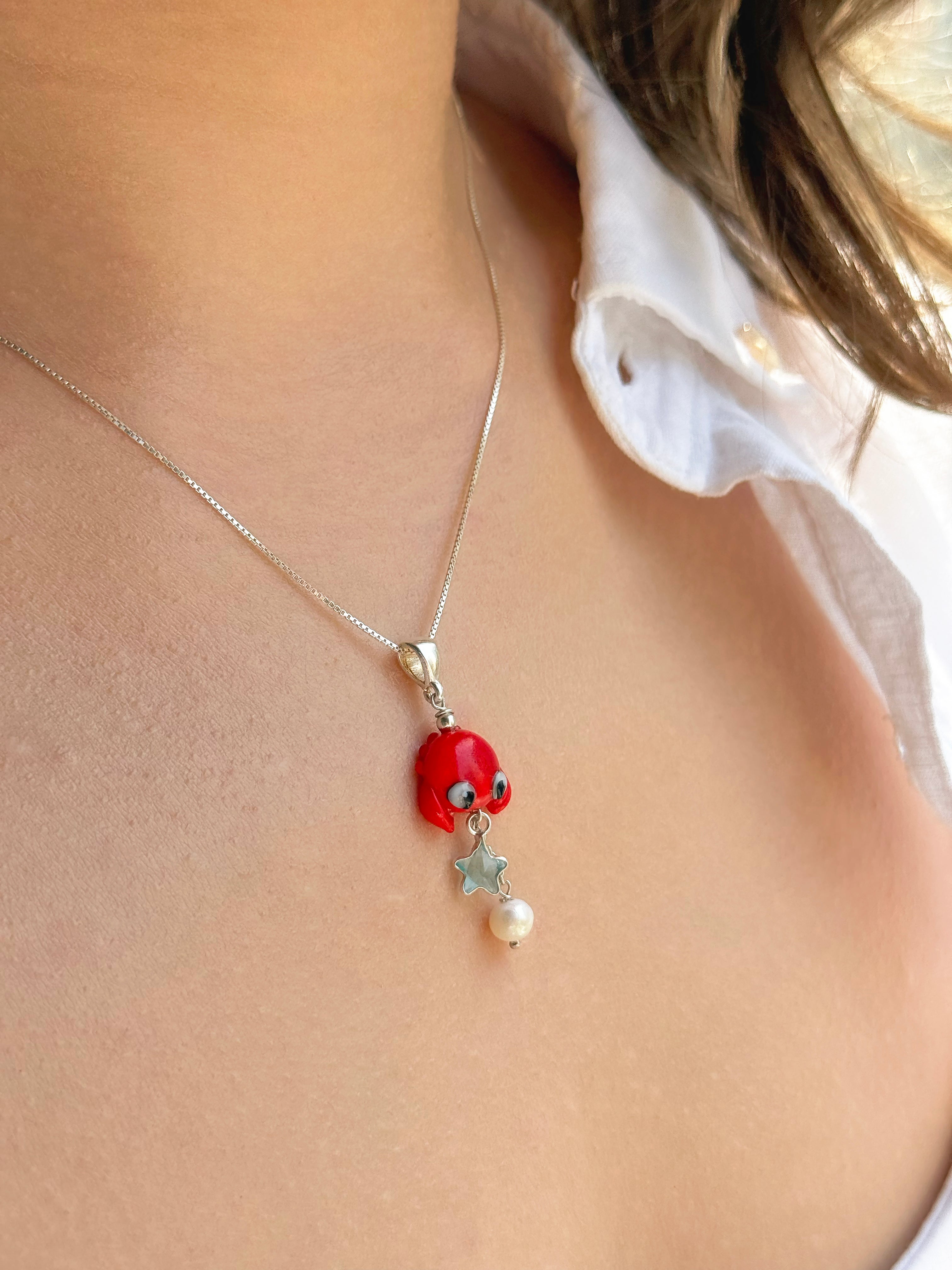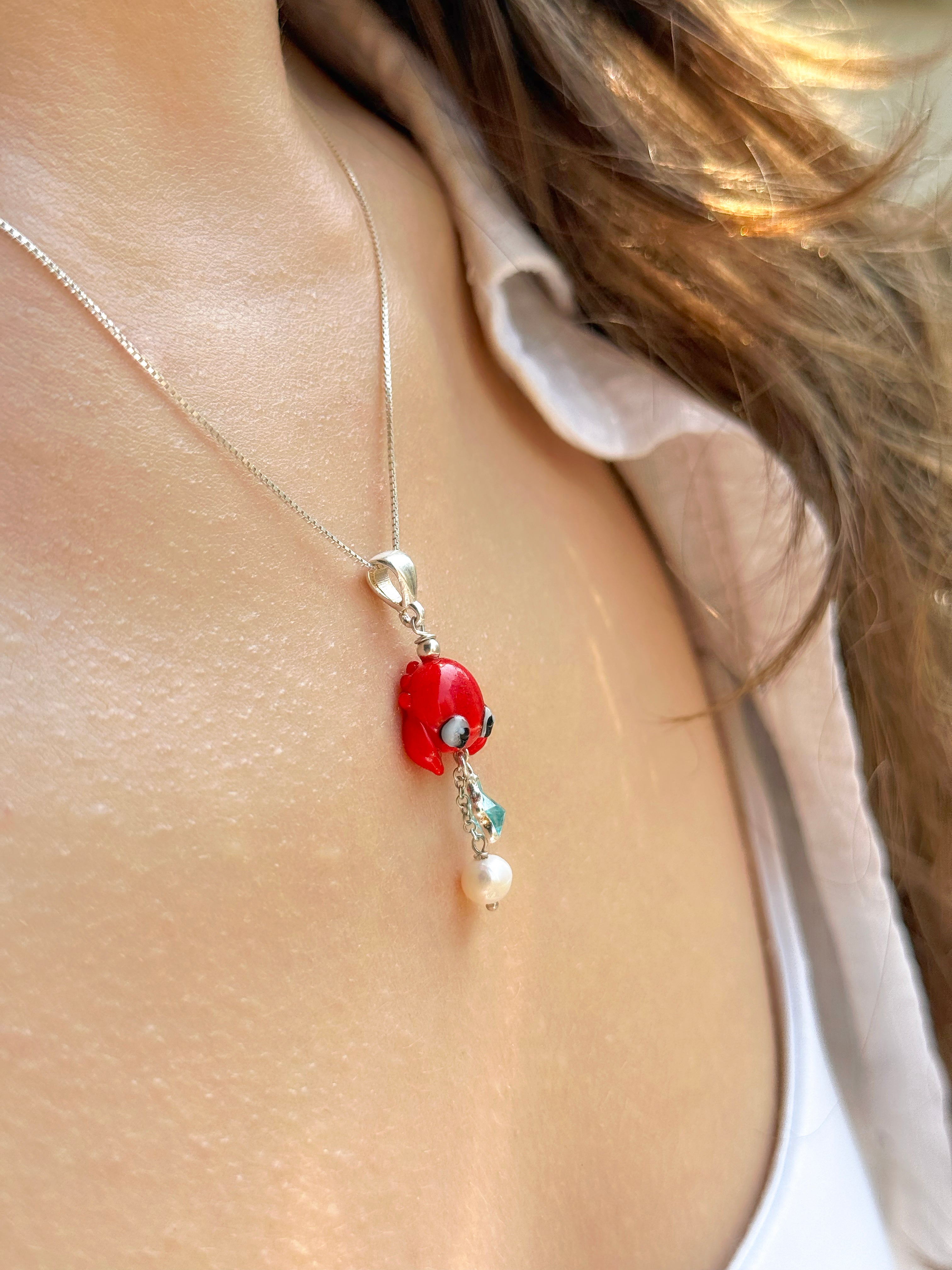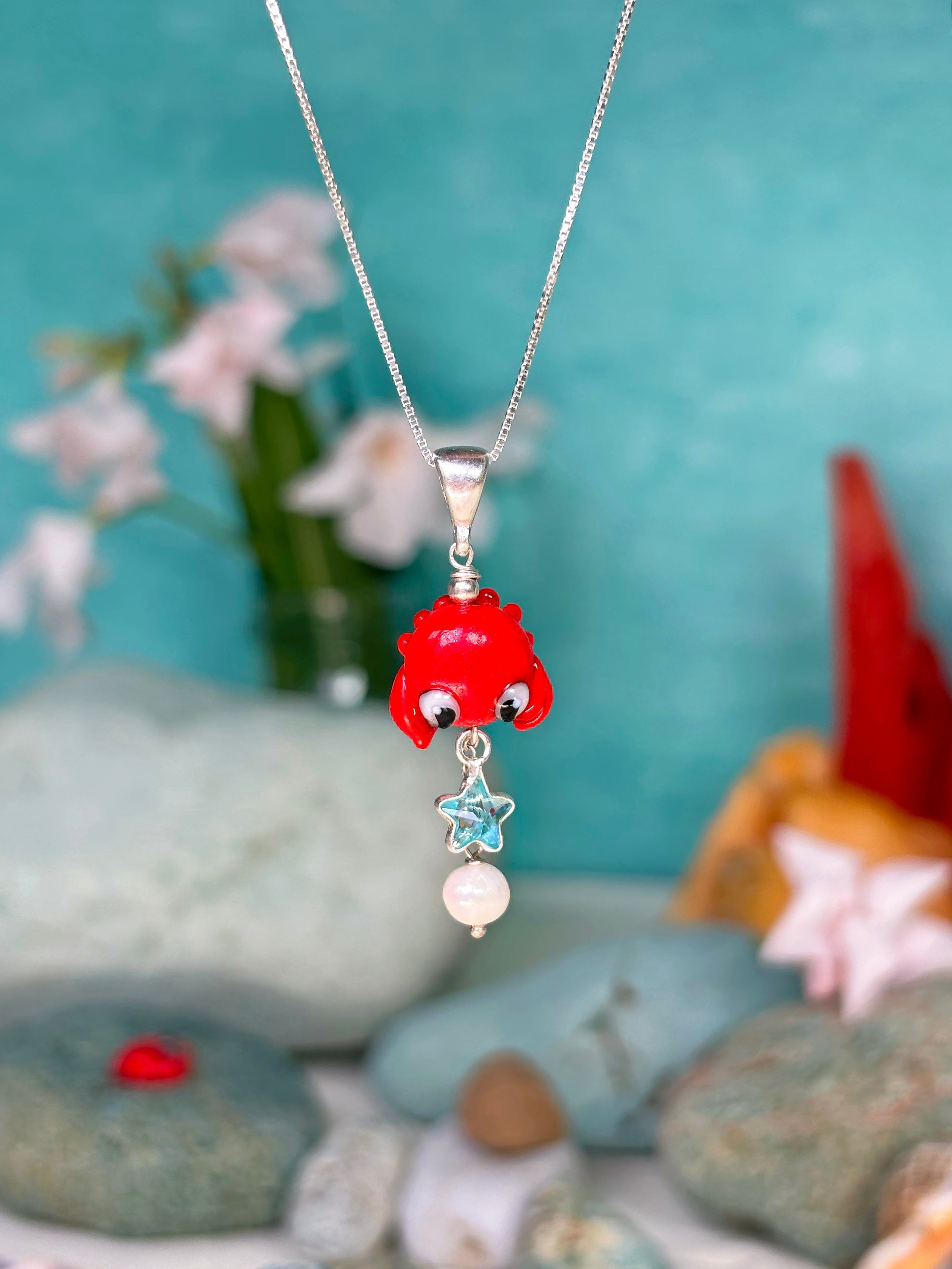 Each adorable little crab in this pendant is flame-sculpted by hand from Murano and Bohemian glass using the centuries-old lampwork technique. Every bead is shaped in a 1 000 °C flame for 30–45 minutes, then annealed in a kiln for 8 hours to ensure strength and durability.